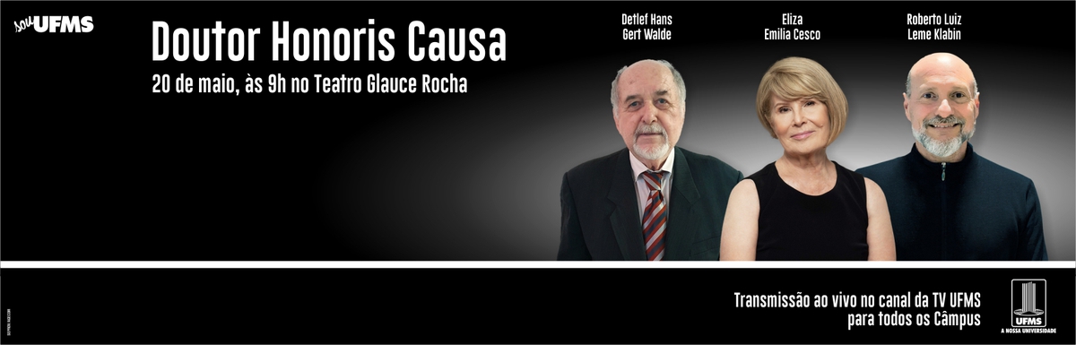 O pesquisador Detlef Hans Gert Walde, a educadora Eliza Emília Cesco e o empresário Roberto Luiz Leme Klabin recebem nesta sexta-feira, 20, o título de Doutor Honoris Causa. A cerimônia será realizada às 9 horas, no Teatro Glauce Rocha, na Cidade Universitária, com transmissão ao vivo para todos os Câmpus pelo canal da TV UFMS.