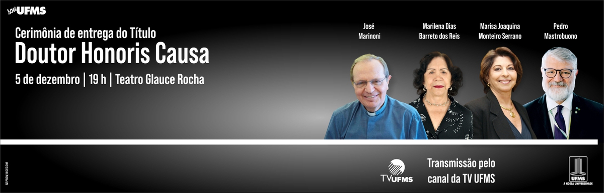 No dia 5 de dezembro, às 19h, o reitor Marcelo Turine presidirá a cerimônia de entrega de Título Doutor Honoris Causa para quatro personalidades de destaque nas áreas da Educação e do Patrimônio Artístico e Cultural do estado: José Marinoni, padre, educador e reitor da Universidade Católica Dom Bosco; Marilena Dias Barreto dos Reis, professora e presidente do Instituto Rondon de Educação; Marisa Joaquina Monteiro Serrano, educadora e ex-senadora; e Pedro Mastrobuono, presidente do Instituto de Museus.
