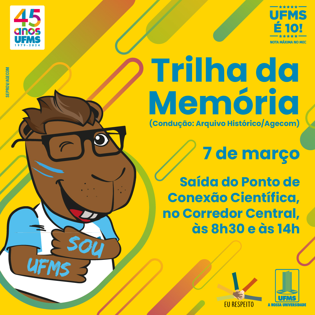 Nesta quinta-feira, 7, estudantes, servidores, colaboradores e a comunidade externa podem conhecer e se aprofundar na história da UFMS, que celebra 45 anos de federal. Contada a partir da ótica do Arquivo Central, da Agência de Comunicação Social e Científica, a Trilha da Memória é uma experiência que percorre o tempo e o espaço, em uma caminhada que apresenta os principais monumentos da Cidade Universitária, com apoio de documentos administrativos e do acervo institucional, rico em materiais e informações de caráter histórico.