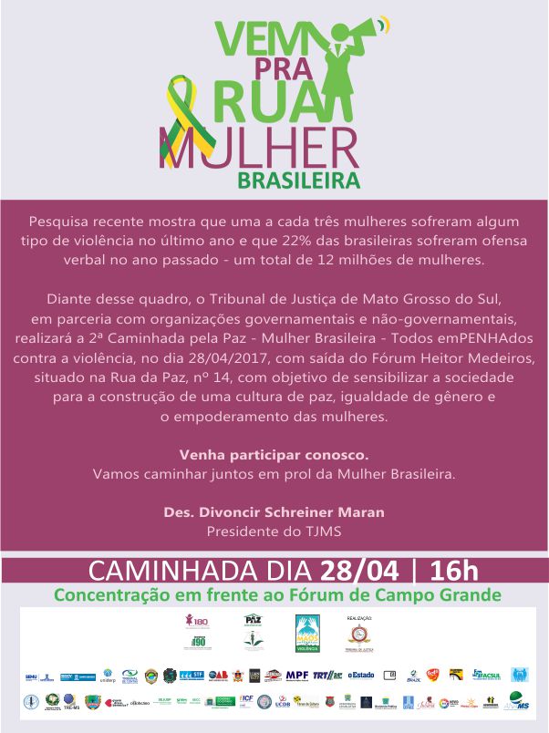 O Poder Judiciário de Mato Grosso do Sul, por intermédio da Coordenadoria Estadual da Mulher em situação de Violência Doméstica, idealizou a 2ª Caminhada Pela Paz – Mulher Brasileira – Todos emPENHAdos contra a violência. O evento será realizado no dia 28 de abril, às 16h, no centro de Campo Grande-MS
