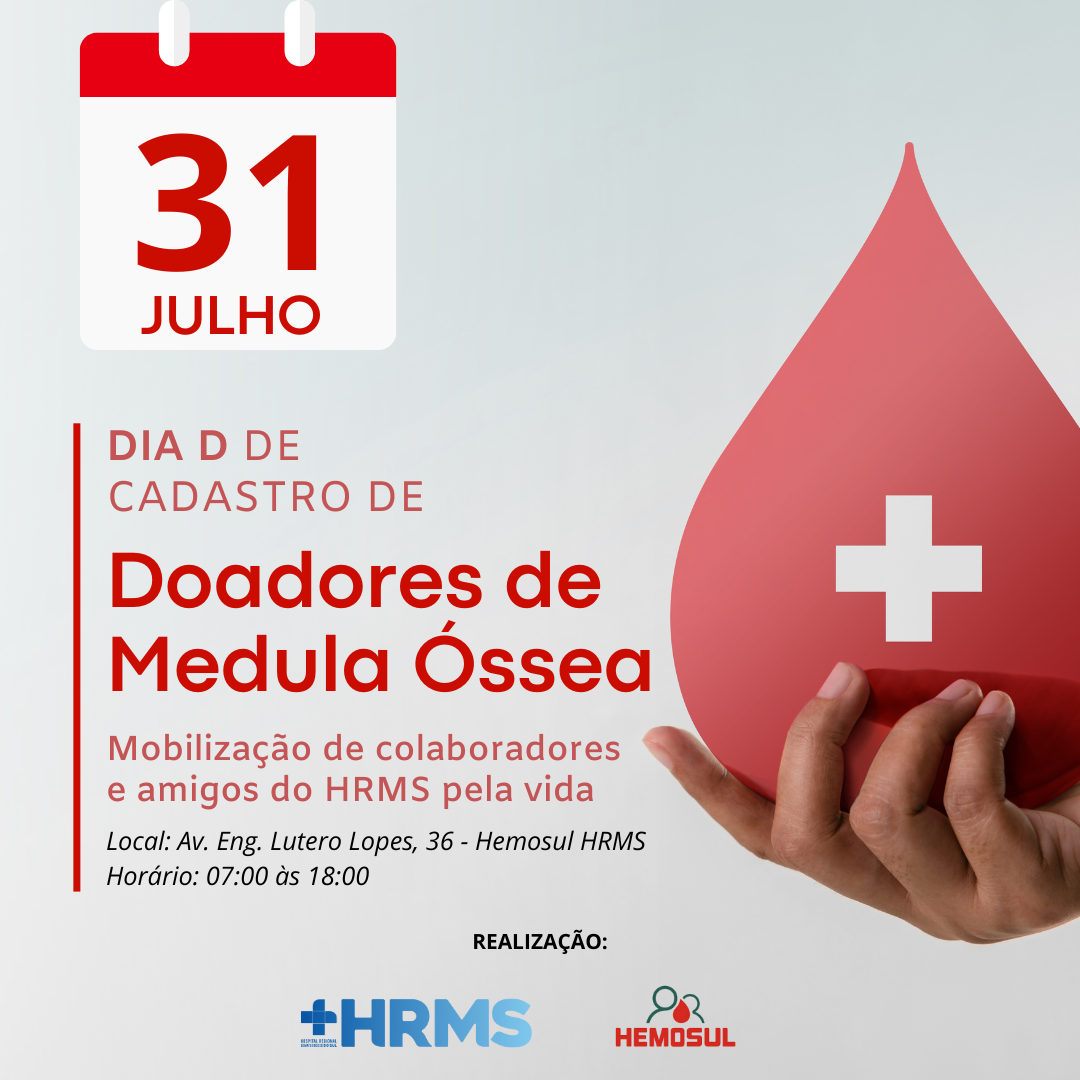 Nesta quarta-feira, 31, o Hospital Regional de Mato Grosso do Sul (HRMS) realiza o Dia D de Cadastro de Doadores de Medula. A campanha consiste em dedicar um dia inteiro para o cadastro de doadores. A ação é realizada em parceria com a Rede Hemosul MS, com apoio da UFMS.