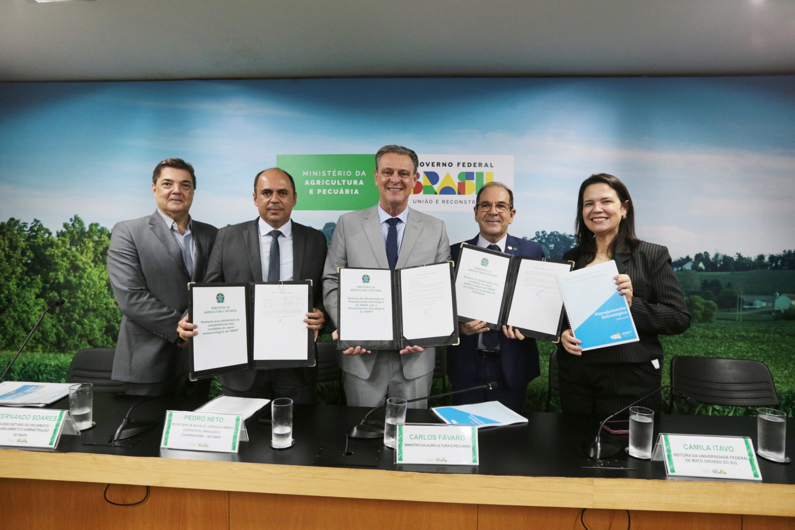 A reitora Camila Ítavo participou nesta quinta-feira, 28, de cerimônia realizada em Brasília para celebração dos 115 anos do Instituto Nacional de Meteorologia (Inmet), órgão vinculado ao Ministério da Agricultura e Pecuária (Mapa). Na ocasião, o ministro Carlos Fávaro anunciou o novo Planejamento Estratégico para o período 2025-2031. O documento foi elaborado com apoio técnico da Faculdade de Engenharias, Arquitetura e Urbanismo e Geografia (Faeng) e do Instituto de Física (Infi), por meio de articulação institucional realizada pela Agência de Internacionalização e de Inovação (Aginova) da UFMS.