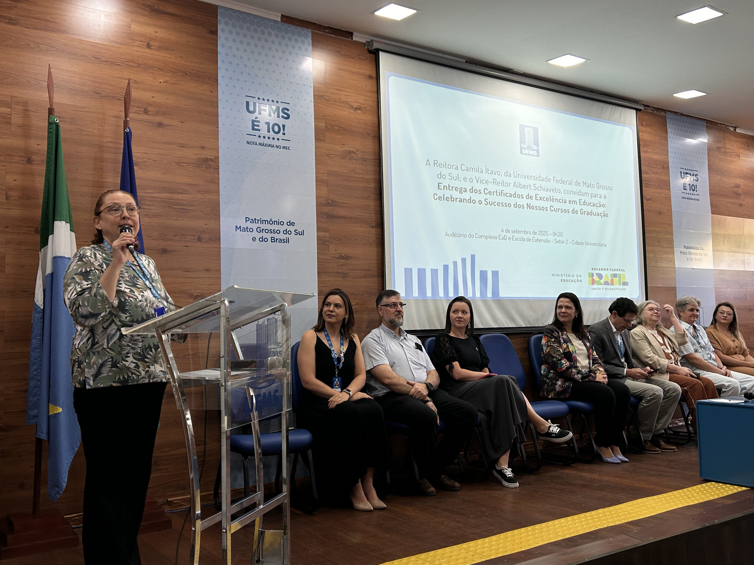 Professores, estudantes, servidores e gestores estiveram reunidos no auditório do Complexo de EaD e Escola de Extensão para comemorar o sucesso e a excelência dos cursos. “Sabemos os desafios e as relações que permeiam o processo de ensino-aprendizagem. Cada vez mais temos aprimorado a nossa Instituição. Somos nota mil! Precisamos ter o conceito máximo e isso precisa reverberar na esperança renovada, relação humana saudável, em uma Universidade marcada pela qualidade, integridade e respeito entre as pessoas. Agradeço a todos vocês pela atuação magnífica. Qual o nosso sonho estratégico da UFMS? Alcançar, no Índice Geral de Cursos, conceito 5. Já fomos 3, hoje somos 4. Tivemos o primeiro curso da Universidade com qualidade reconhecida pelo sistema Mercosul, através do Arcosul, que foi o curso de Engenharia da Computação e vamos passar pela avaliação de outros. Precisamos fazer mais e diferente, pois temos maturidade institucional. Quero agradecer a todos vocês pelo empenho e dedicação”, disse a reitora.