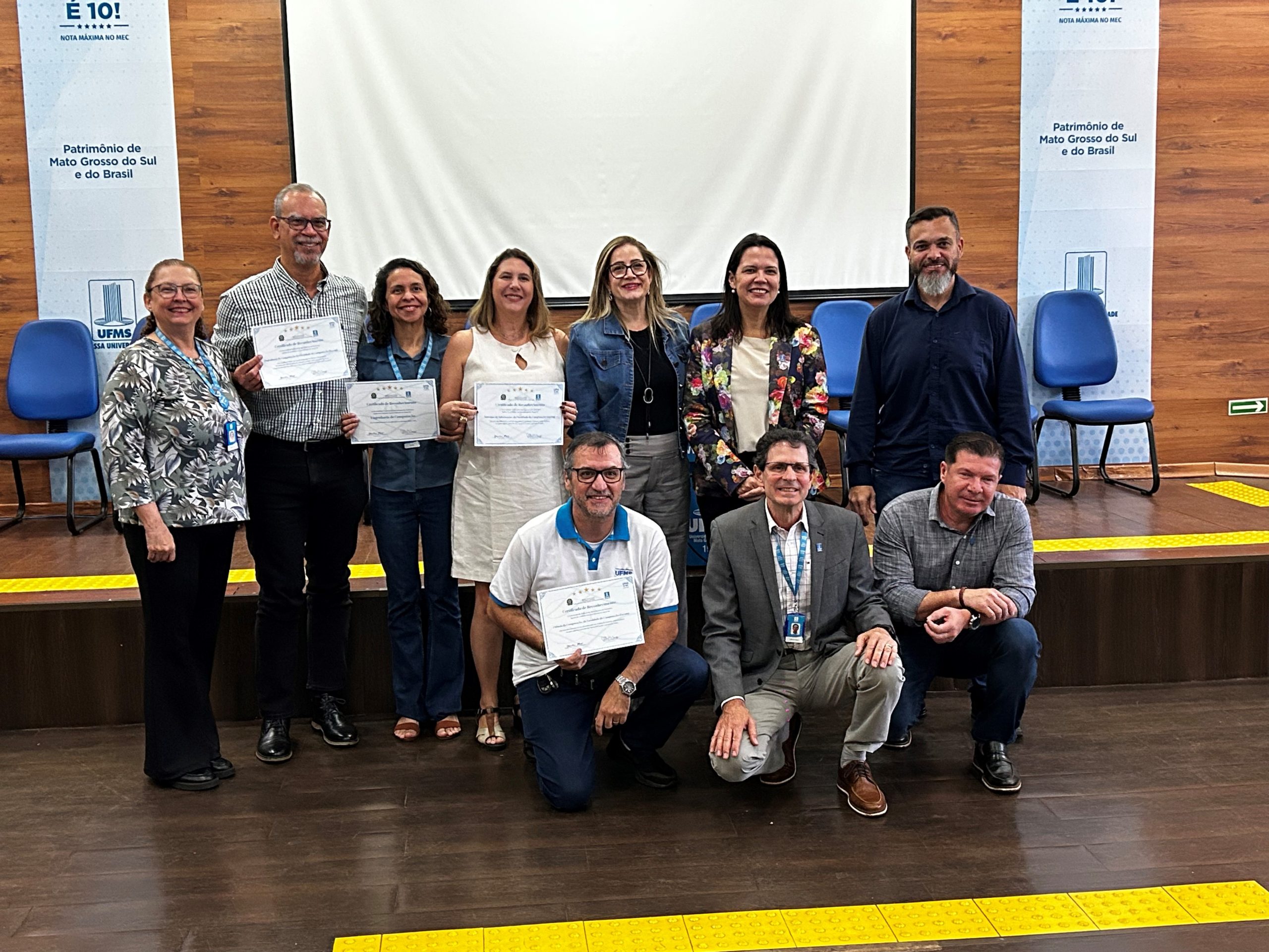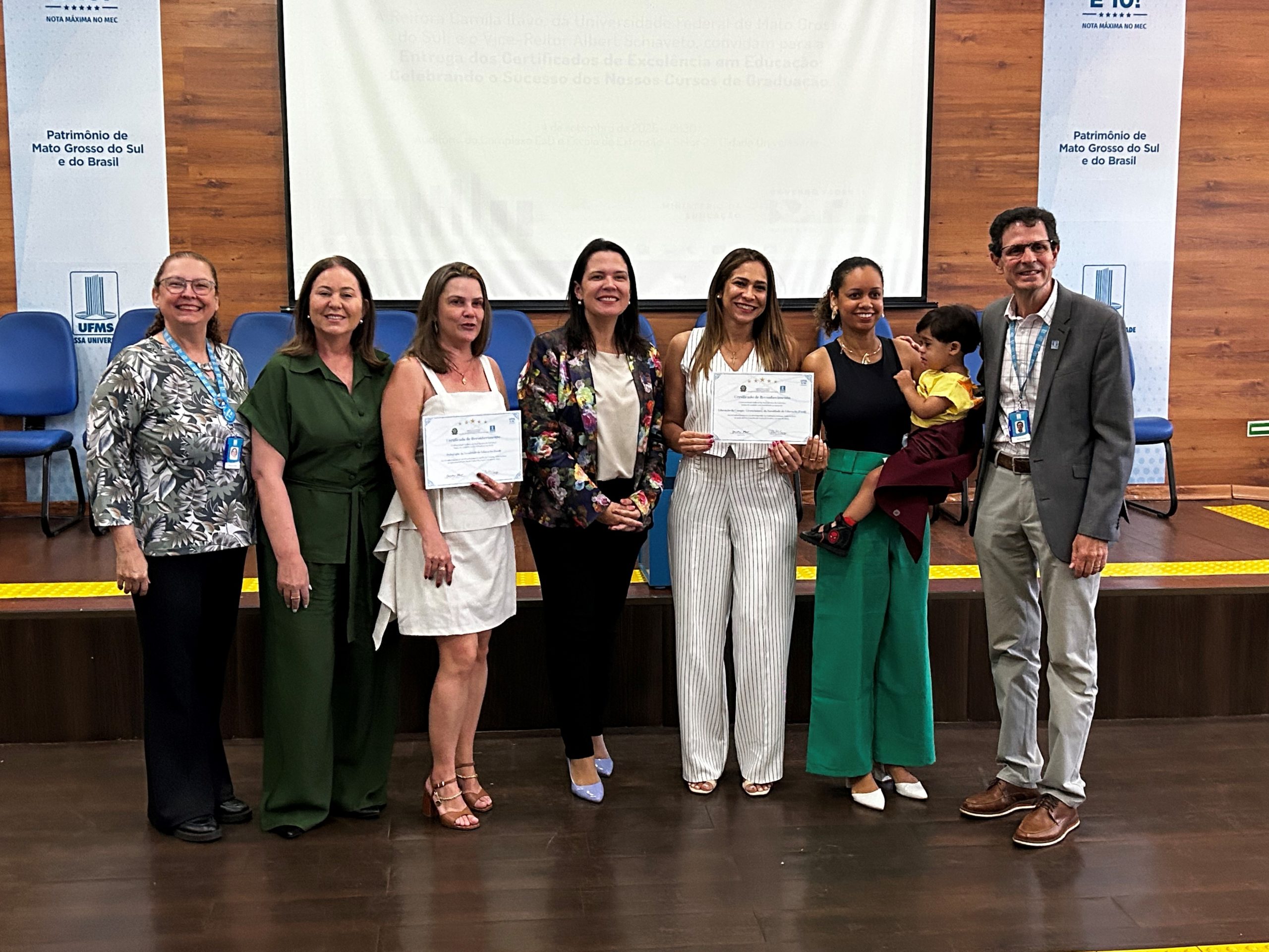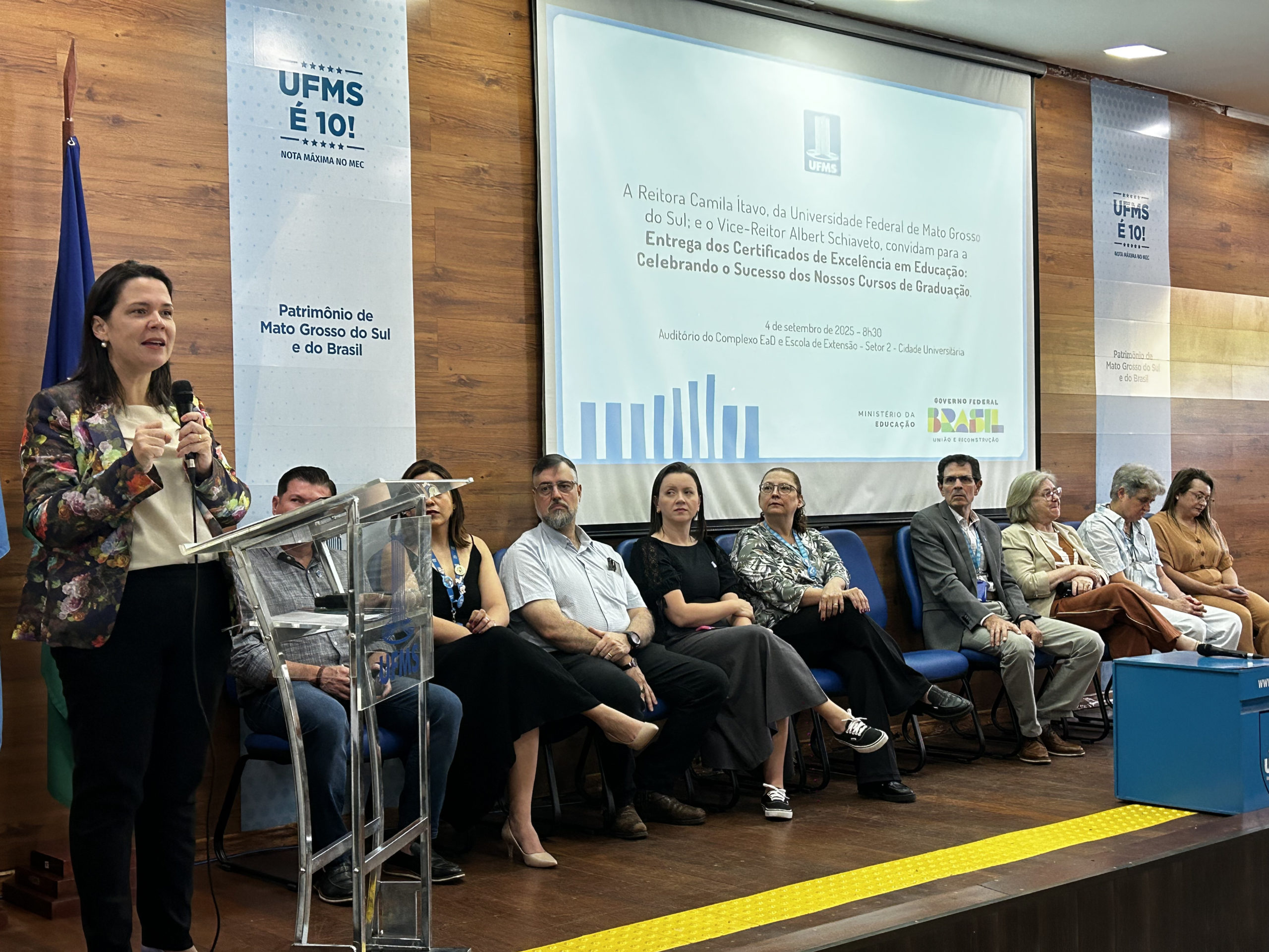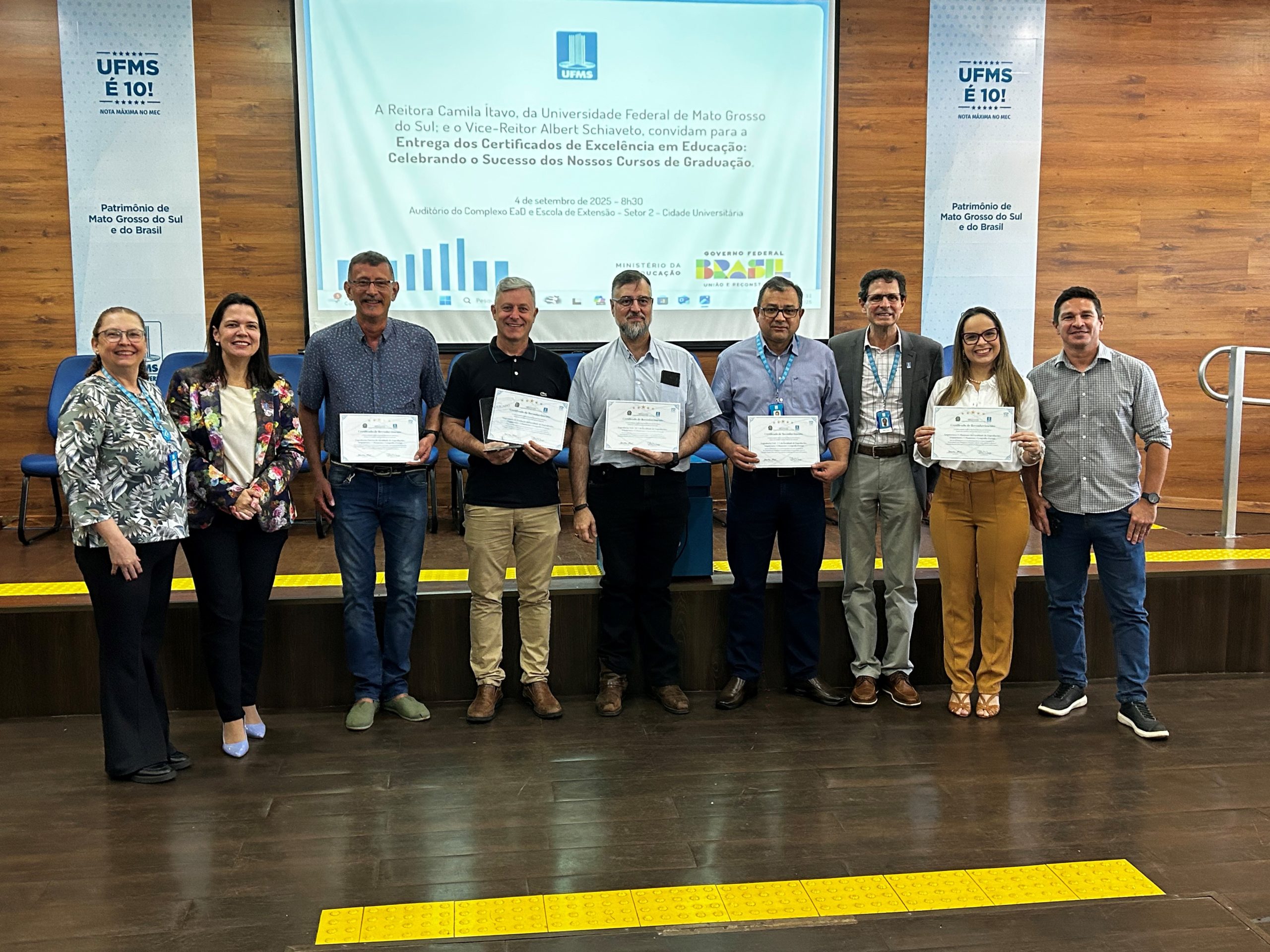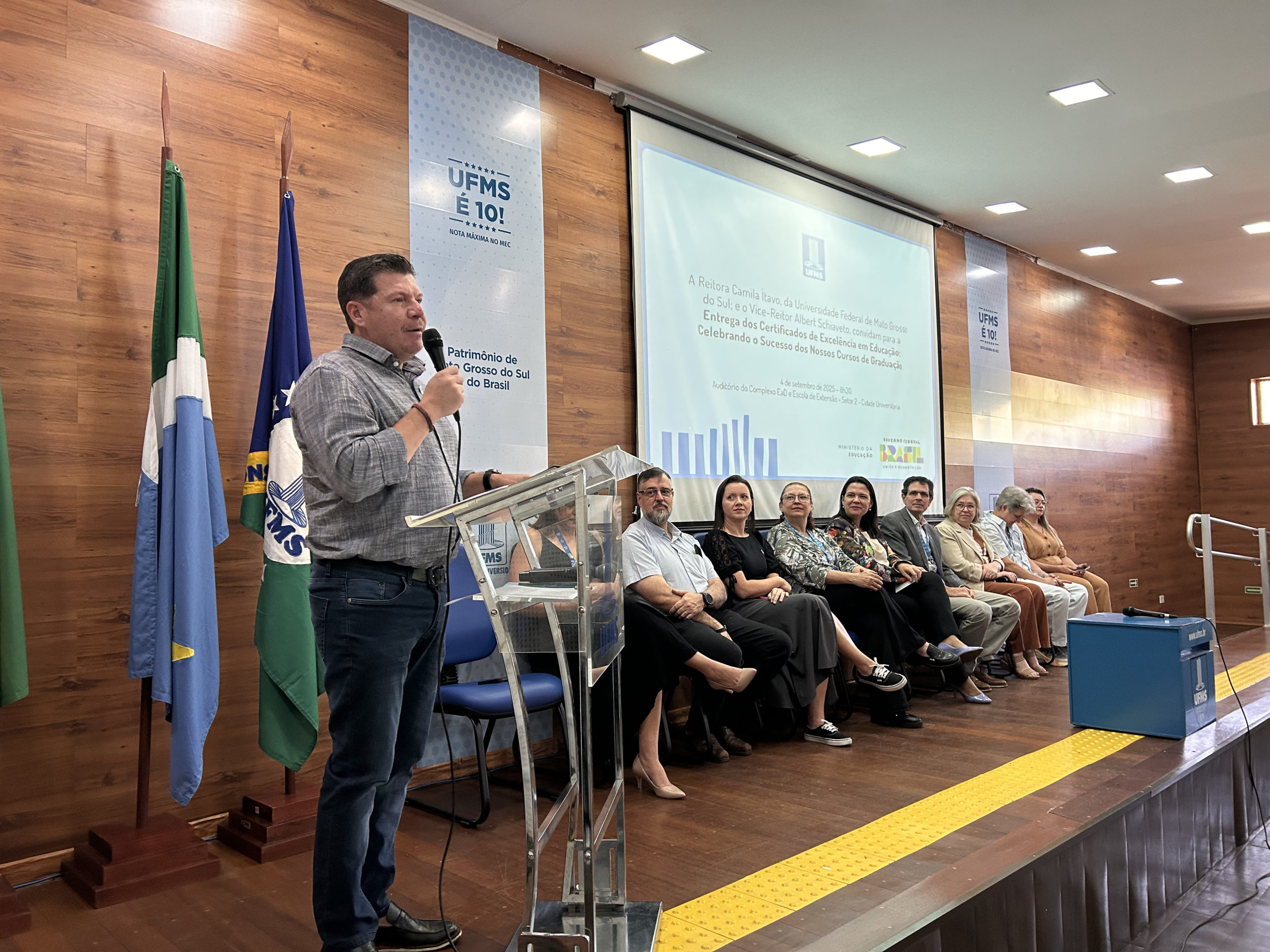 “Que festa linda! A UFMS tem brilhado cada vez mais. Quando os nossos cursos tiram uma nota na avaliação de reconhecimento ou no Enade, isso representa o trabalho de toda a comunidade universitária. Quando certificamos os cursos de excelência, fazemos um agradecimento a todos, gestores, professores, técnicos e os nossos estudantes. A nossa Universidade tem como visão ser acessível a todos, reconhecida internacional e nacionalmente em termos de ensino, pesquisa, inovação, extensão, cultura, esporte, lazer, sustentabilidade, empreendedorismo e popularização da ciência. Estamos em um momento muito bom, pois isso tem acontecido. Parabéns a todos vocês, nosso muito obrigado mais do que merecido”, falou o vice-reitor.