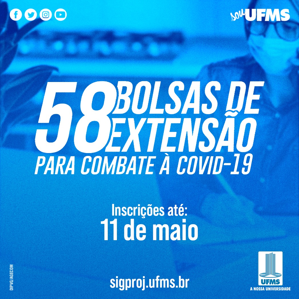 Estão abertas as inscrições para estudantes de graduação da UFMS atuarem como bolsistas de extensão nos projetos e ações de combate à Covid-19. Ao todo são 58 oportunidades em diversas áreas distribuídas na Cidade Universitária e nos câmpus de Aquidauana, Coxim, do Pantanal, Paranaíba e Três Lagoas.