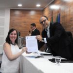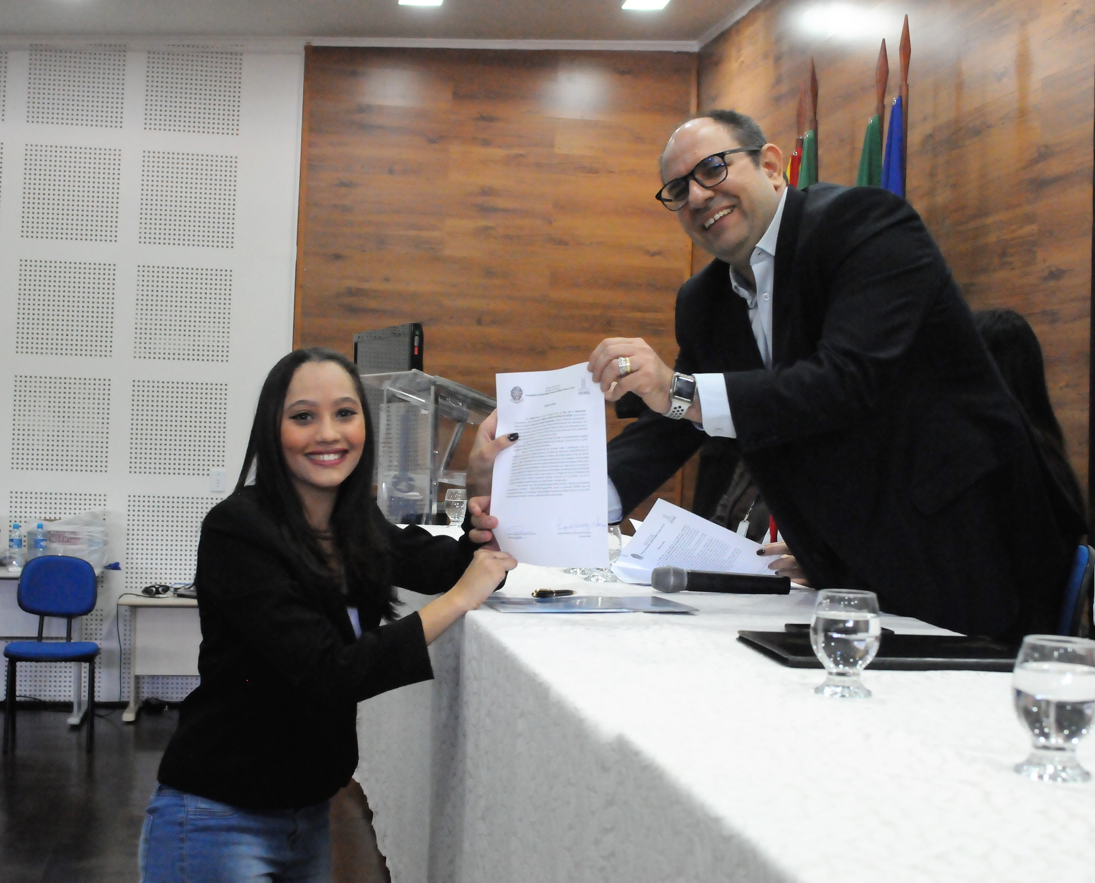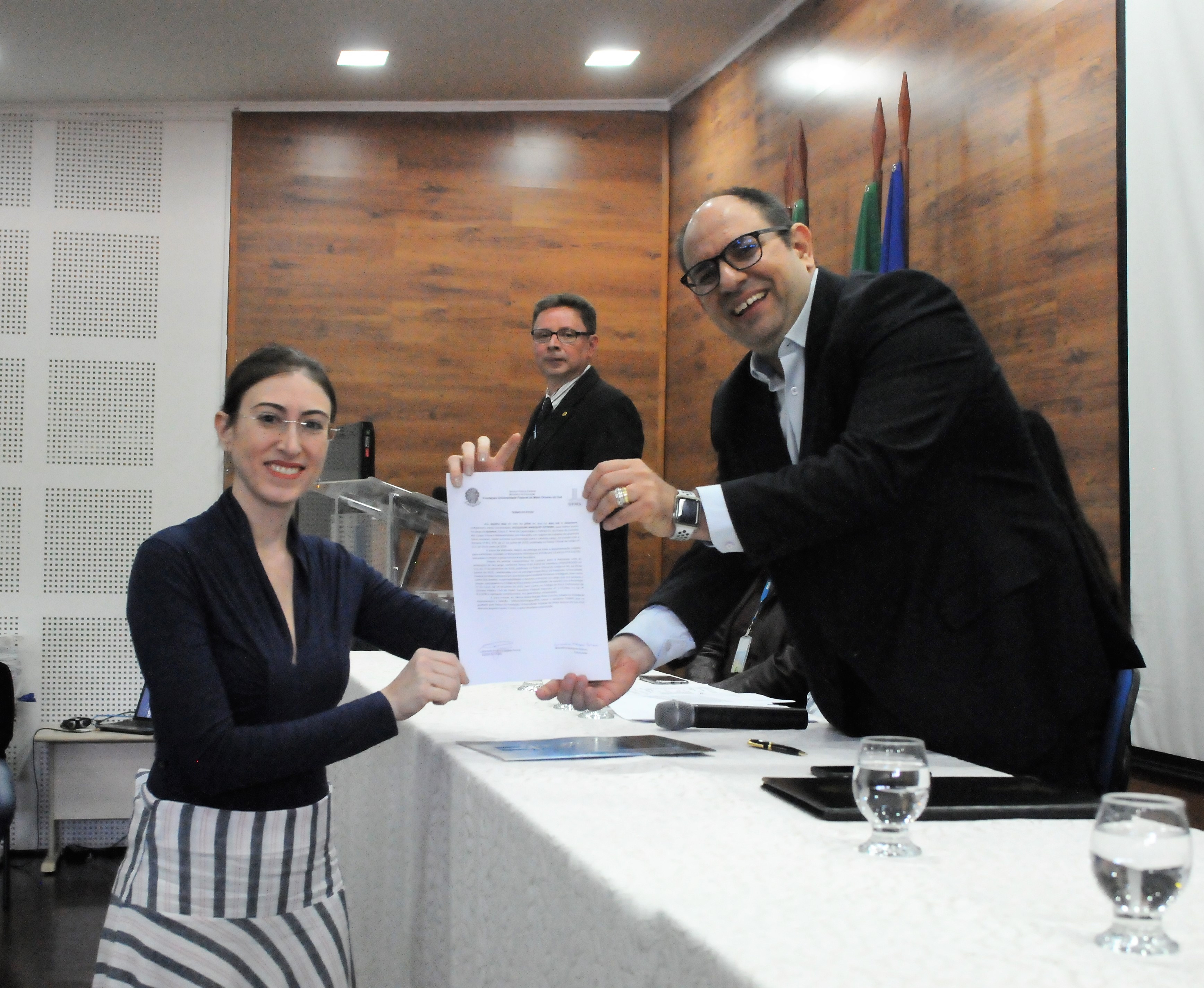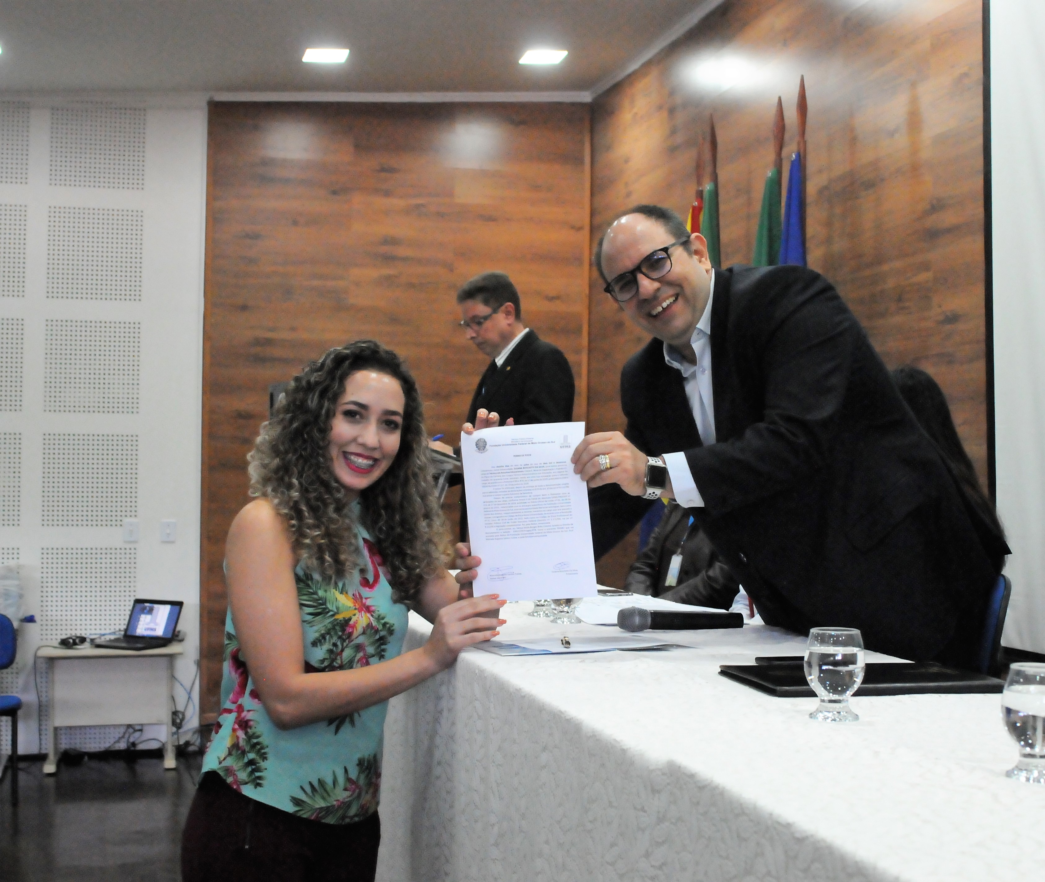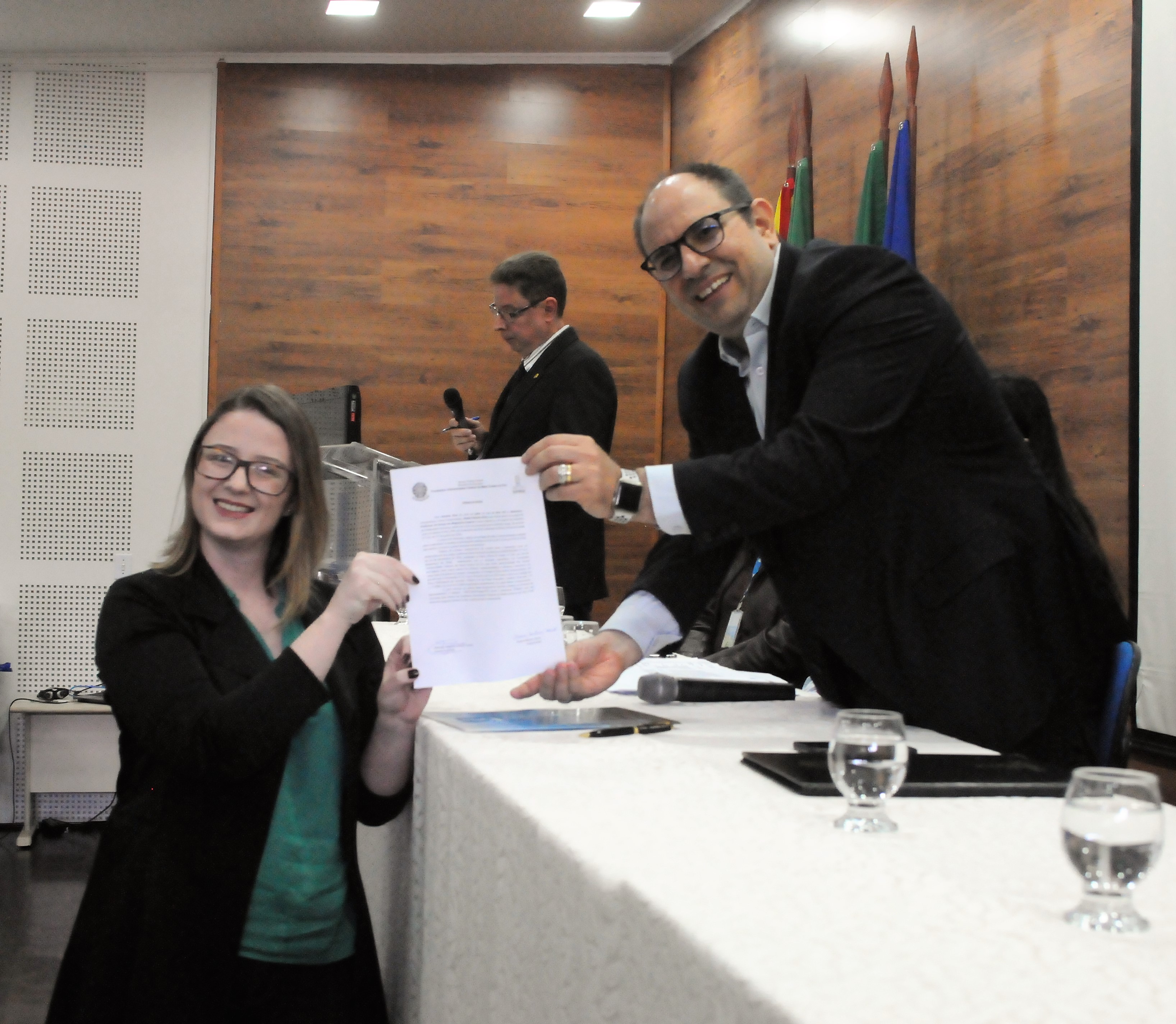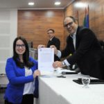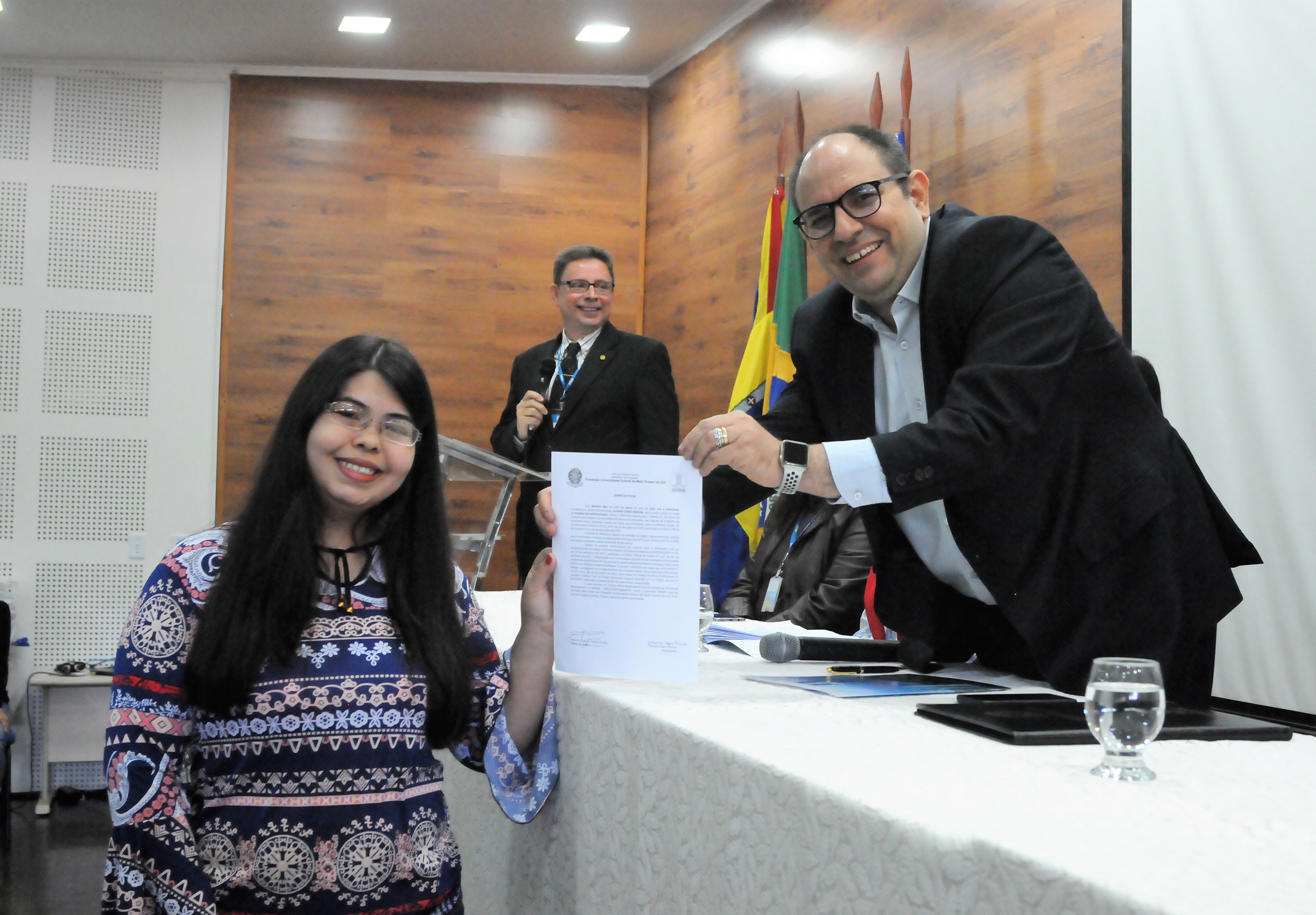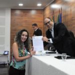 “É uma alegria muito grande tomar posse na Instituição na qual me formei, passa uma retrospectiva de tudo o que já vivi na UFMS na cabeça. Estou ansiosa e muito feliz de trabalhar aqui”, contou Yasmin Gomes Casagranda, que fez graduação, mestrado, doutorado e atualmente realiza pós-doutorado em Administração na Escola de Administração e Negócios (Esan) da UFMS.
