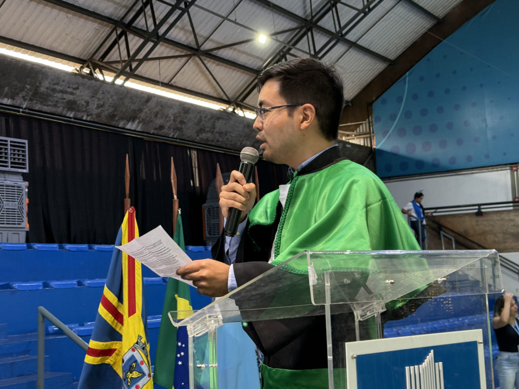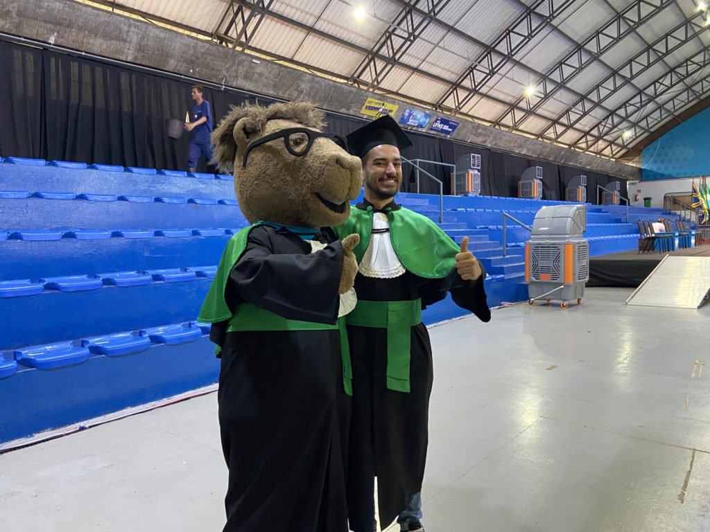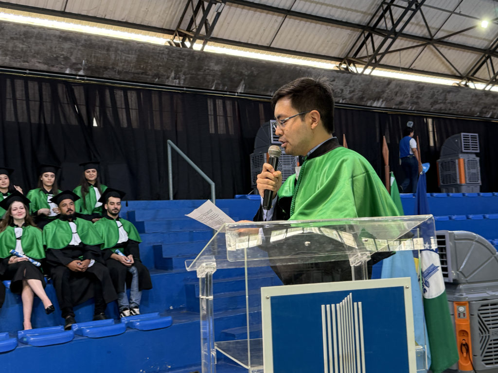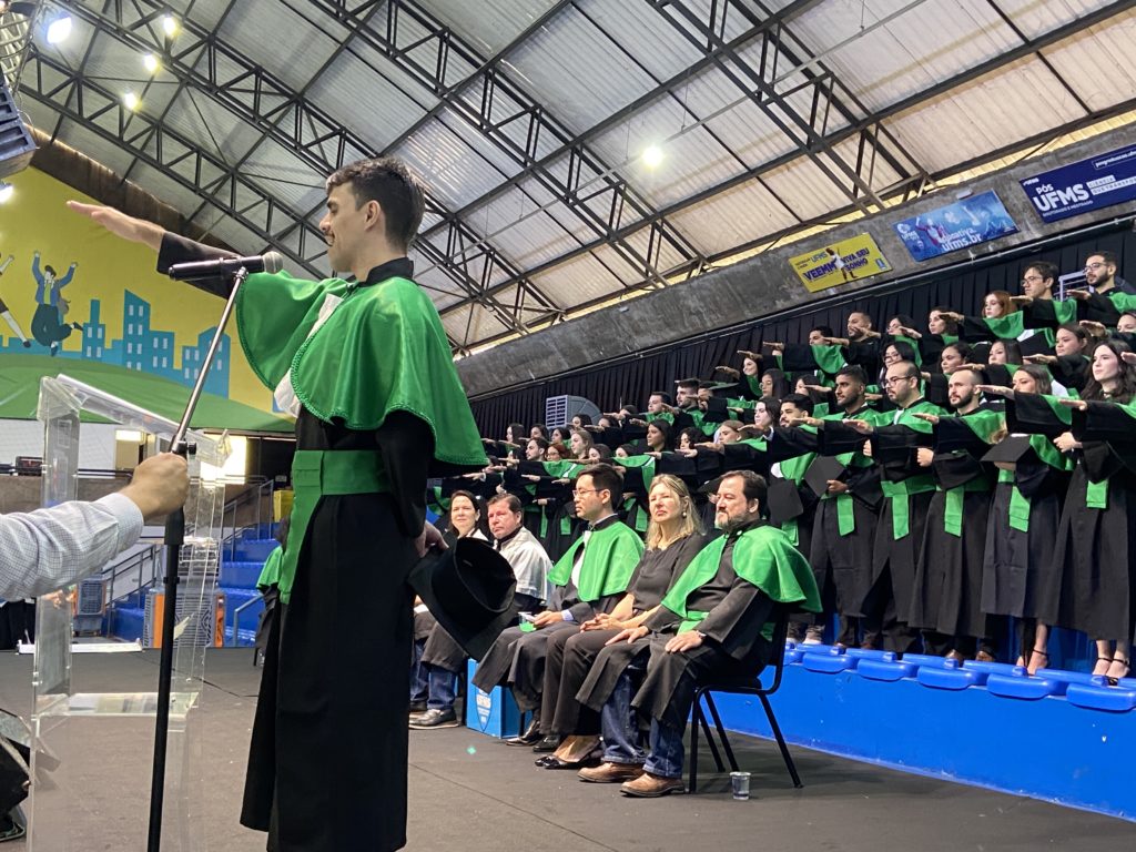 O juramento foi proferido pelo formando João César Pereira da Cunha, que foi acompanhado, em pé, pelos demais. Na imposição do grau, feita pela reitora Camila Ítavo, a formanda Laysa Gomes Osório representou os concluintes.