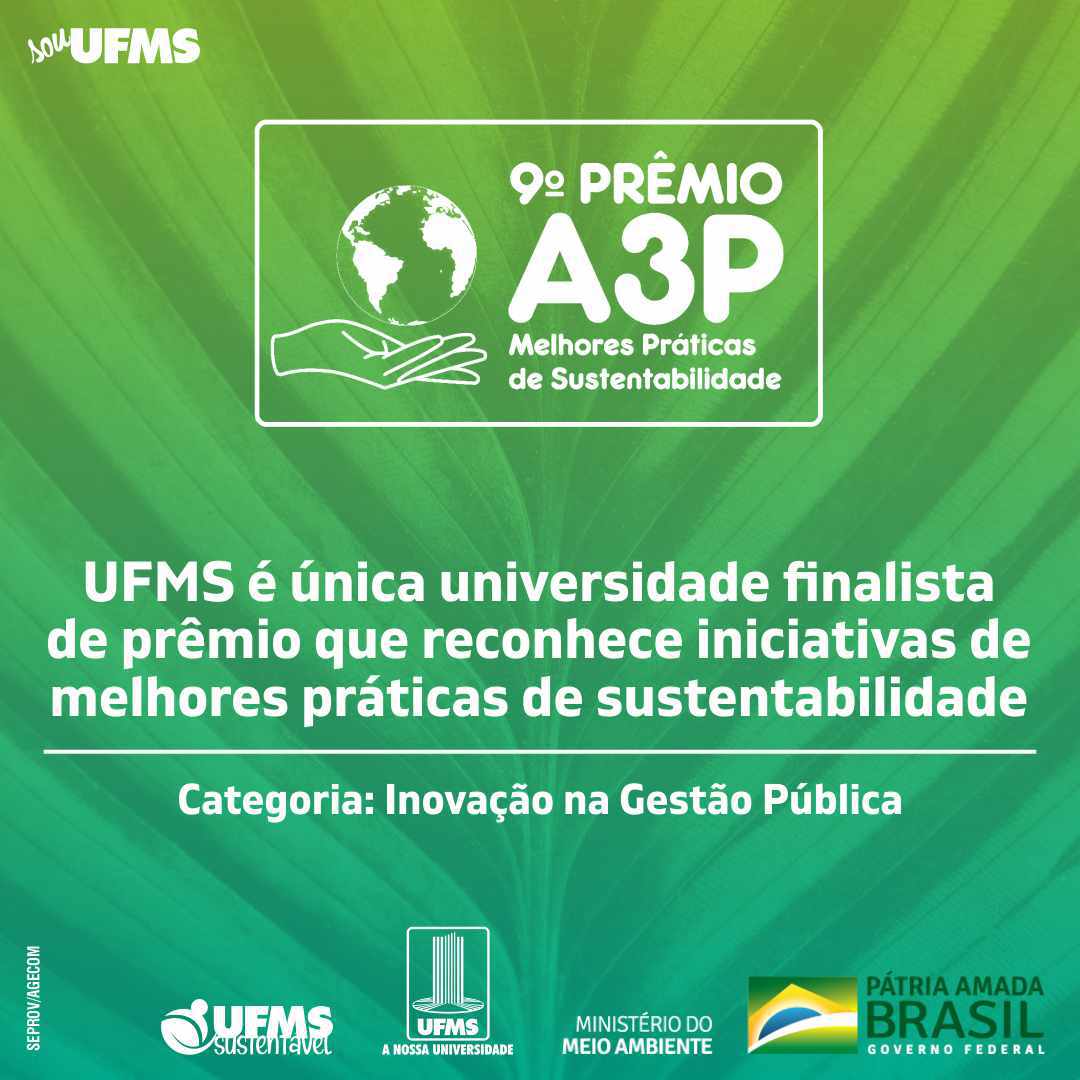 A UFMS é a única universidade entre os finalistas do 9° Prêmio Agenda Ambiental na Administração Pública (A3P) de Melhores Práticas de Sustentabilidade, promovido pelo Ministério do Meio Ambiente. A Universidade foi selecionada na categoria Inovação na Gestão Pública, com o Desafio UFMS Sustentável.
