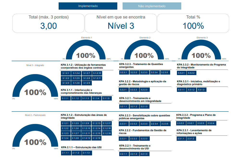 A avaliação é baseada no modelo de Maturidade em Integridade Pública, que reúne diretrizes para o fortalecimento da integridade em órgãos e entidades do Poder Executivo Federal. Como parte do Sistema de Integridade, Transparência e Acesso à Informação (Sitai), esse modelo é estruturado nas seguintes dimensões: governança e estrutura organizacional para a integridade; capacidade organizacional para a integridade; e gestão e desempenho da integridade. Para que as instituições identifiquem seu estágio e planejem melhorias, cada dimensão é dividida em cinco níveis de maturidade: inicial, padronizado, integrado, gerenciado e otimizado.