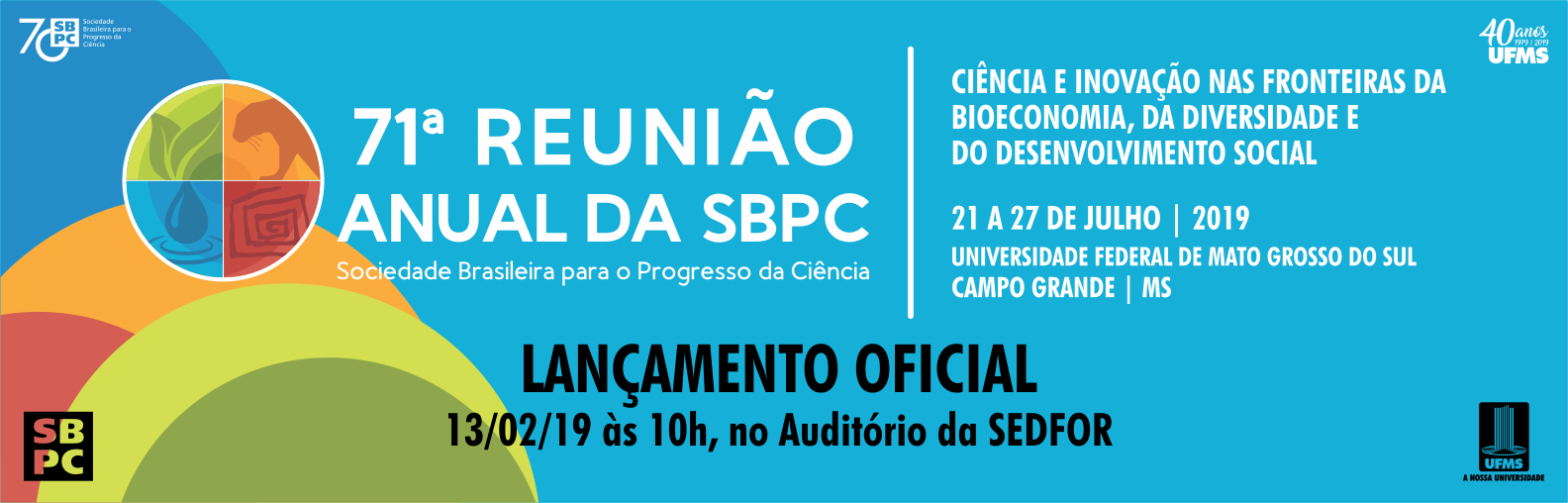 Na próxima quarta-feira, dia 13, às 10h, o reitor Marcelo Turine e o presidente da SBPC, Ildeu de Castro Moreira, fazem o lançamento oficial da 71ª Reunião Anual que será realizada na UFMS, de 21 a 27 de julho deste ano. É a primeira vez que Mato Grosso do Sul receberá a maior feira científica da América Latina.