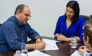 Durante reunião na tarde de hoje, 6, o Reitor da UFMS, professor Marcelo Turine, e a Secretária de Estado de Direitos Humanos, Assistência Social e Trabalho (SEDHAST), Elisa Cléa Nobre assinaram o termo aditivo de Cooperação para a regulação das condições e realização de Estágios do Programa Vale Universidade. O termo terá vigência até 1º de abril de 2019.