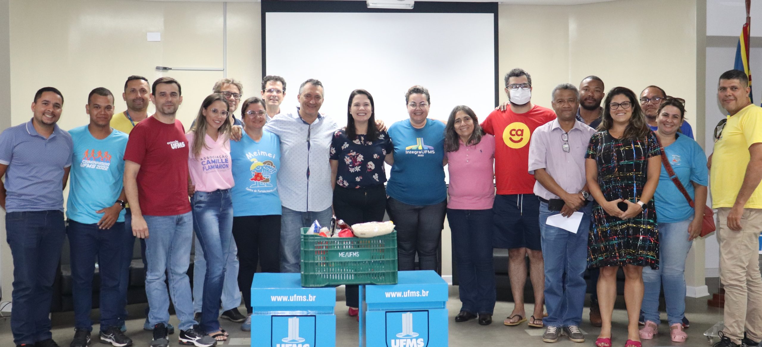 Nesta quarta-feira, 21, foi realizada a entrega de 200 quilos de alimentos arrecadados em ações culturais e esportivas promovidas pela UFMS. Três instituições foram beneficiadas: Associação Camille Flammarion, Instituto Causadores da Alegria e Sociedade Assistencial Meimei. “A Universidade tem uma missão muito clara ligada à educação superior, mas o servir tem que sempre estar presente. Entregar, hoje, mais um resultado das atividades realizadas, como a Volta UFMS e ações de cultura, e, ainda, próximo ao Natal é muito bom”, falou o pró-reitor de Extensão, Cultura e Esporte (Proece), Marcelo Fernandes.