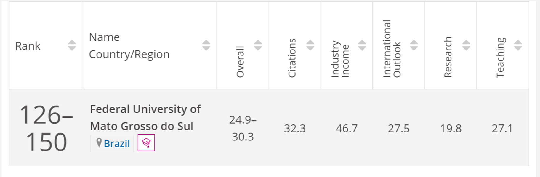 A UFMS foi classificada pela segunda vez no ranking Universidades da América Latina 2021, organizado pela Times Higher Education (THE), e garantiu sua posição na faixa das 126–150 melhores universidades latinas, entre as 177 instituições avaliadas.