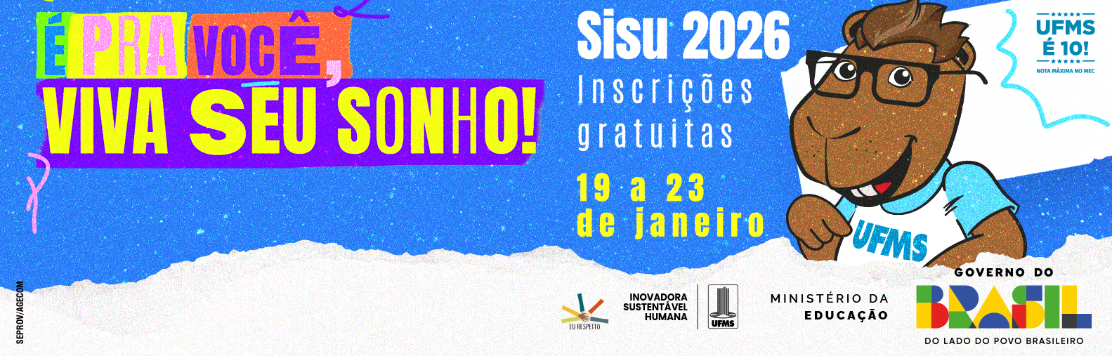 Com a divulgação do resultado do Enem 2025 pelo Instituto Nacional de Estudos e Pesquisas Educacionais Anísio Teixeira (Inep), os interessados em ingressar em um curso de graduação da UFMS por meio do Sistema de Seleção Unificada (Sisu), do Ministério da Educação (MEC), terão de 19 a 23 de janeiro para inscrição no portal único de acesso ao Ensino Superior. Ao todo, serão ofertadas 3.233 vagas em mais de 120 cursos distribuídos na UFMS de Aquidauana, Campo Grande, Chapadão do Sul, Coxim, Naviraí, Nova Andradina, Paranaíba, Ponta Porã, Três Lagoas e do Pantanal.