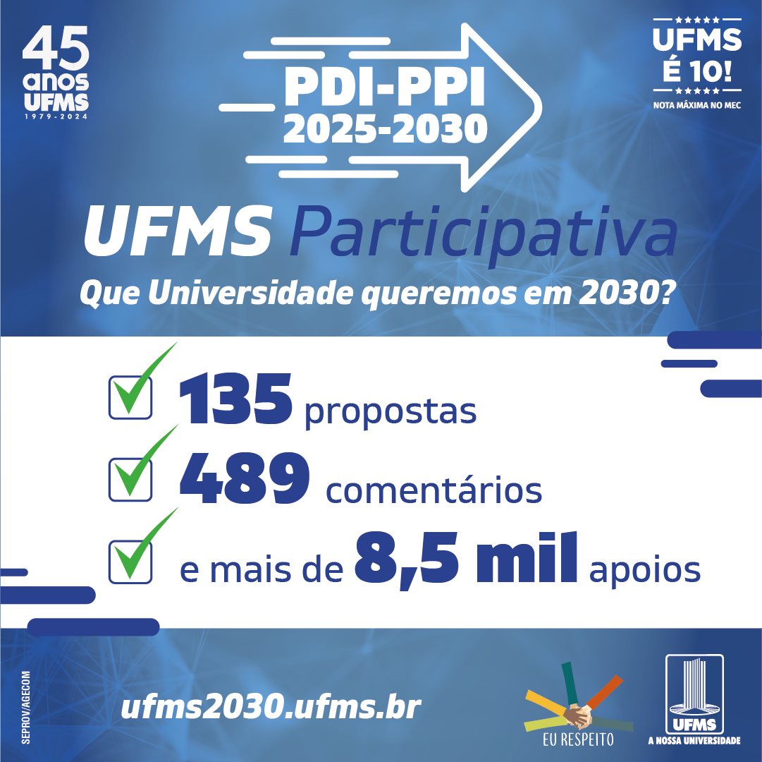 A UFMS Participativa recebeu 135 propostas, 489 comentários e mais de 8,5 mil apoios na plataforma digital ufms2030.ufms.br. Os números refletem o envolvimento de toda a comunidade na criação do Plano de Desenvolvimento Institucional (PDI) 2025-2030, integrado ao Projeto Pedagógico Institucional (PPI) da UFMS.