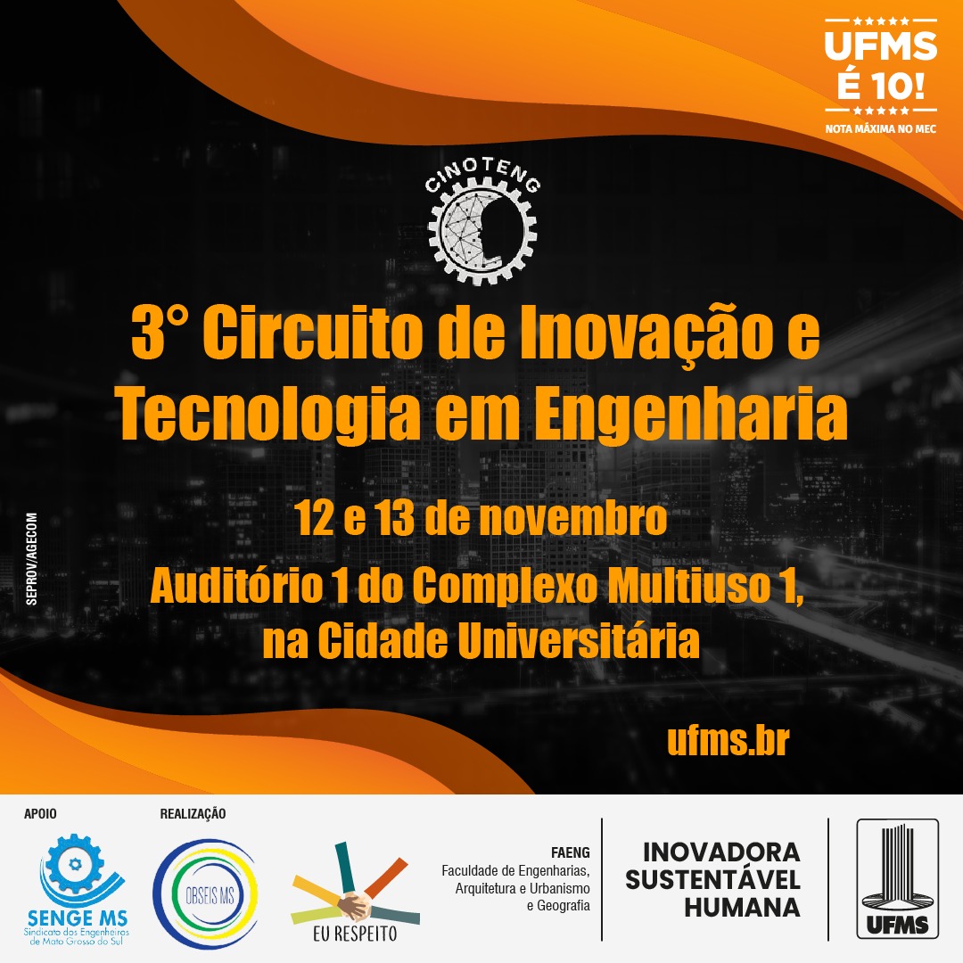 Nos dias 12 e 13 de novembro, a Universidade Federal de Mato Grosso do Sul realiza o 3º Circuito de Inovação e Tecnologia em Engenharia (Cinoteng). O evento, organizado pela Faculdade de Engenharias, Arquitetura e Urbanismo e Geografia (Faeng), será no Auditório 1 do Complexo Multiuso e deve reunir estudantes, professores e profissionais interessados em discutir o futuro das Engenharias e sua relação com o mercado de trabalho.