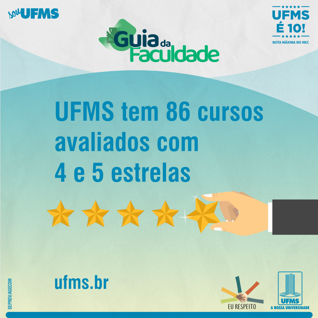 Oitenta e seis cursos de graduação da UFMS foram classificados com 5 e 4 estrelas na edição de 2023 do Guia da Faculdade, que avalia Instituições de Ensino Superior de todo o país. Outros três cursos receberam 3 estrelas. A avaliação e as notas do Guia são atribuídas por mais de 10,5 mil coordenadores e professores do Ensino Superior brasileiro, que atuam de forma voluntária. Cada curso é distribuído para a avaliação de seis professores.