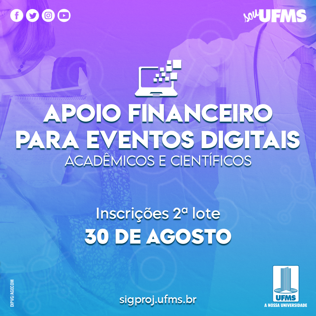 “Gostaria de convidar todos os servidores para submeterem propostas no edital. Por meio desta parceria entre a UFMS e a Fapec, estamos dando oportunidade para quem quiser realizar os eventos digitais obterem recursos. Além disso, é uma importante chance para os estudantes atuarem nos eventos como bolsistas. Como ainda estamos em um contexto de pandemia, tornou-se necessário que os eventos sejam realizados de forma remota. Como há alguns requisitos e procedimentos exigidos no edital, peço que todos fiquem atentos ao período de término das submissões, 30 de agosto, que acontecem apenas pelo Sigproj”, comenta o pró-reitor de Extensão, Cultura e Esporte em exercício João Batista de Santana.