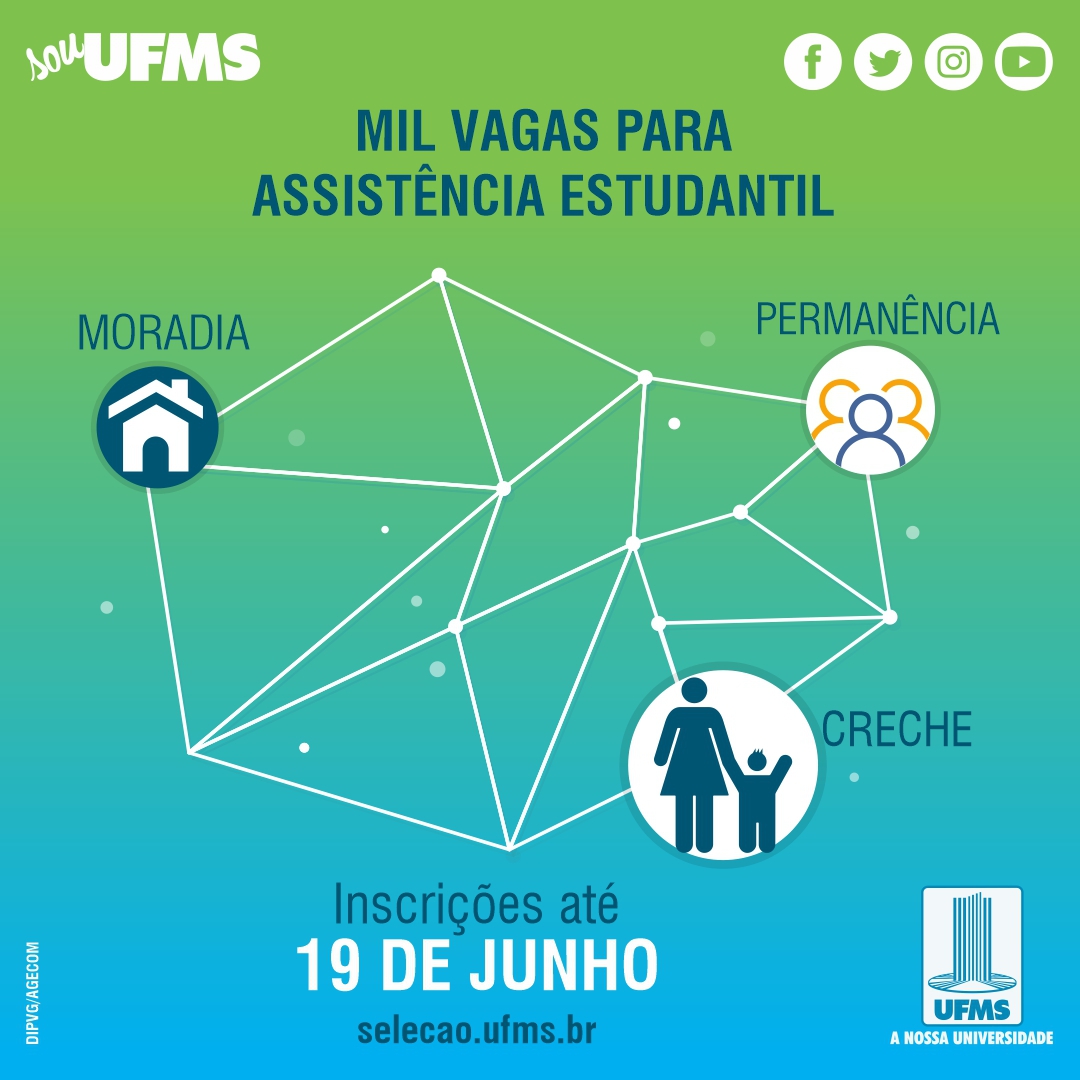 Terminam hoje, 19, as inscrições para as mil vagas ofertadas para Assistência Estudantil. Estudantes de graduação de todos os câmpus interessados nos auxílios Permanência, Moradia e Creche devem atualizar o perfil sociodemográfico no site questionario.ufms.br e realizar a inscrição com o envio de documentos no site selecao.ufms.br.
