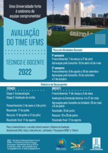 Segundo a secretária, a avaliação de desempenho da carreira técnico-administrativa deve começar a partir de 2 de maio. São três etapas: uma de autoavaliação pelo próprio servidor, outra de avaliação da Chefia Imediata e a terceira de avaliação do Dirigente da Unidade. Também deve ser feita por meio do Siai, no ícone Desempenho da carreira Técnico-Administrativa em 2022, com acesso via Passaporte UFMS e senha.
