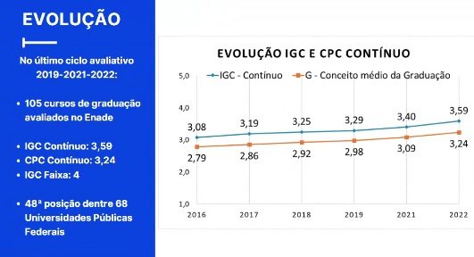 De acordo com a diretora da Diavi, a UFMS é a Instituição que tem maior quantidade de cursos de graduação avaliados – 105 – dentre as 68 universidades federais. “Ao observar o último ciclo avaliativo, de 2019 a 2022, todos os cursos possuem conceitos satisfatórios. Apresentamos evolução em todos os componentes do CPC e no próprio CPC em relação ao ciclo anterior (2016 a 2028). Ao olharmos para o IGC da Instituição veremos que, hoje, estamos na faixa 4, ocupando a 48ª posição entre as universidades públicas federais”, ressalta Caroline.