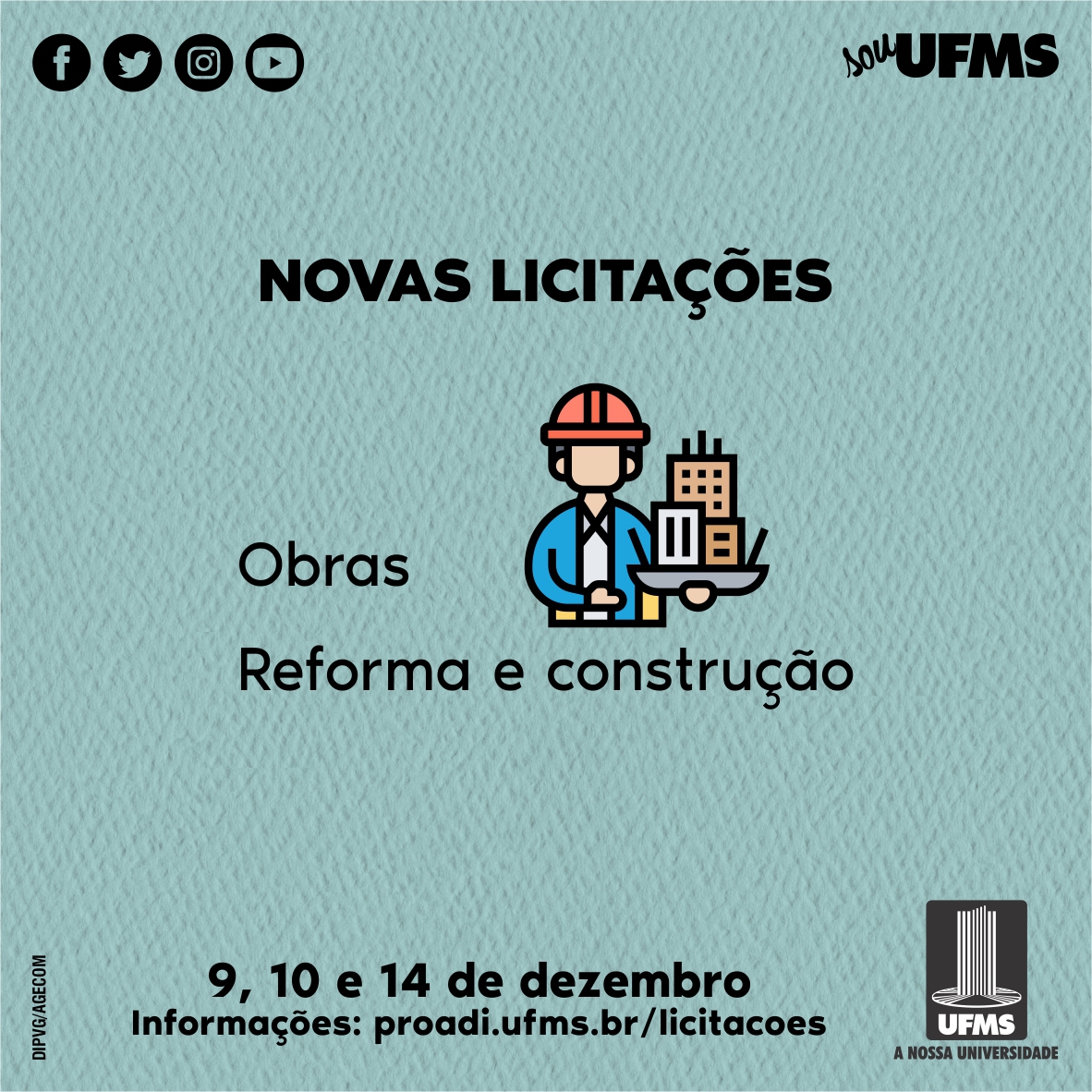 Em dezembro, a UFMS abre três processos licitatórios para contratação de empresas especializadas em serviços de engenharia a fim executar obras de reforma e construção em diferentes unidades da Cidade Universitária. “Assumimos o compromisso de melhorar a infraestrutura existente, sempre observando para isso a política de utilização de espaços”, explica o pró-reitor de Administração e Infraestrutura Augusto Malheiros.