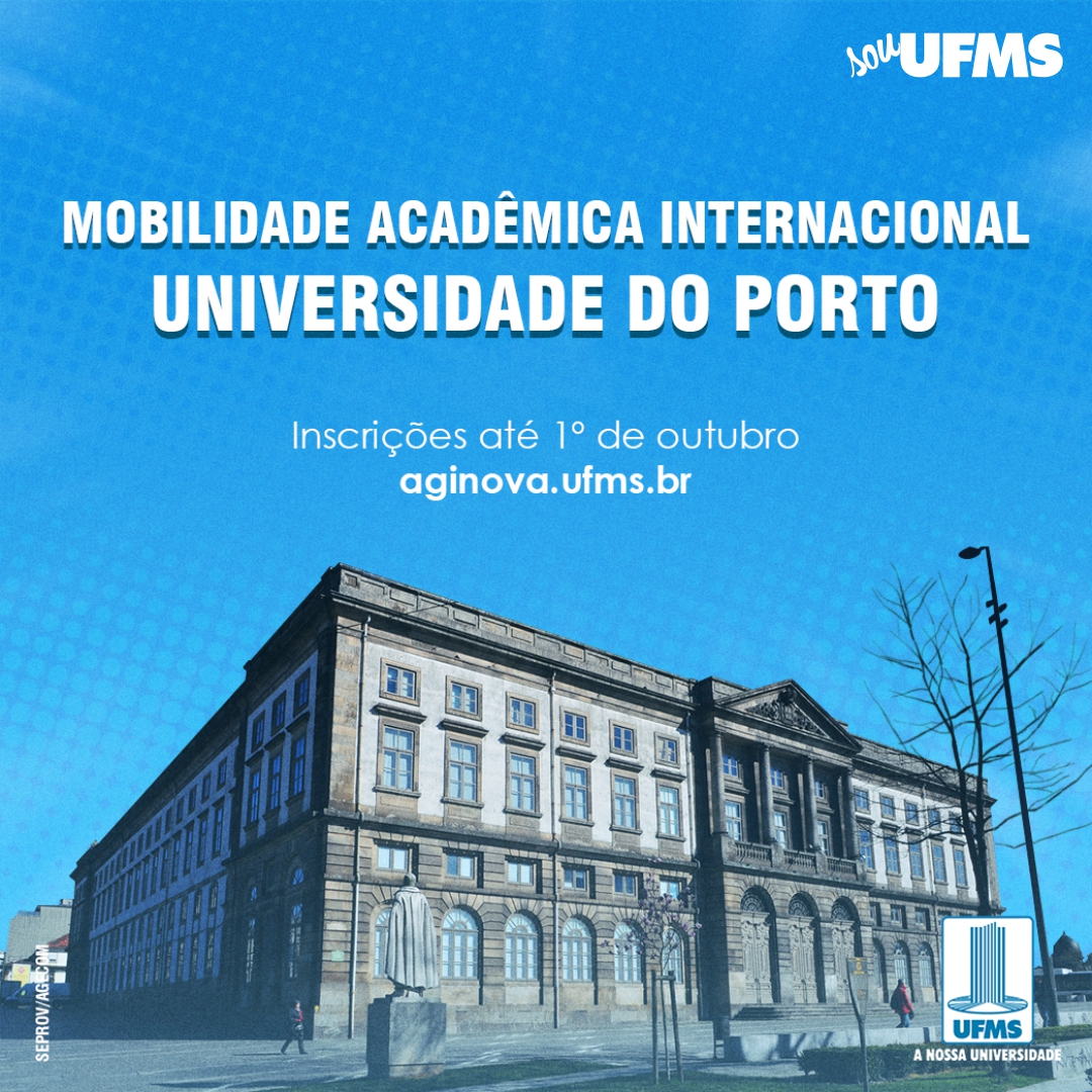Até 1º de outubro, estudantes de graduação e pós-graduação da UFMS podem se inscrever em processo seletivo para mobilidade acadêmica na Universidade do Porto (u. Porto), em Portugal. Há vagas para nove áreas: Arquitetura, Ciências da Nutrição e Alimentação, Desporto, Direito, Economia, Engenharia, Farmácia, Psicologia e Ciências da Educação e Ciências Biomédicas. A oportunidade é fruto de uma ação conjunta da Agência de Internacionalização e Inovação (Aginova), por meio da Secretaria de Relações Internacionais (Serin) e das pró-reitoras de Graduação e Pesquisa e Pós-graduação.