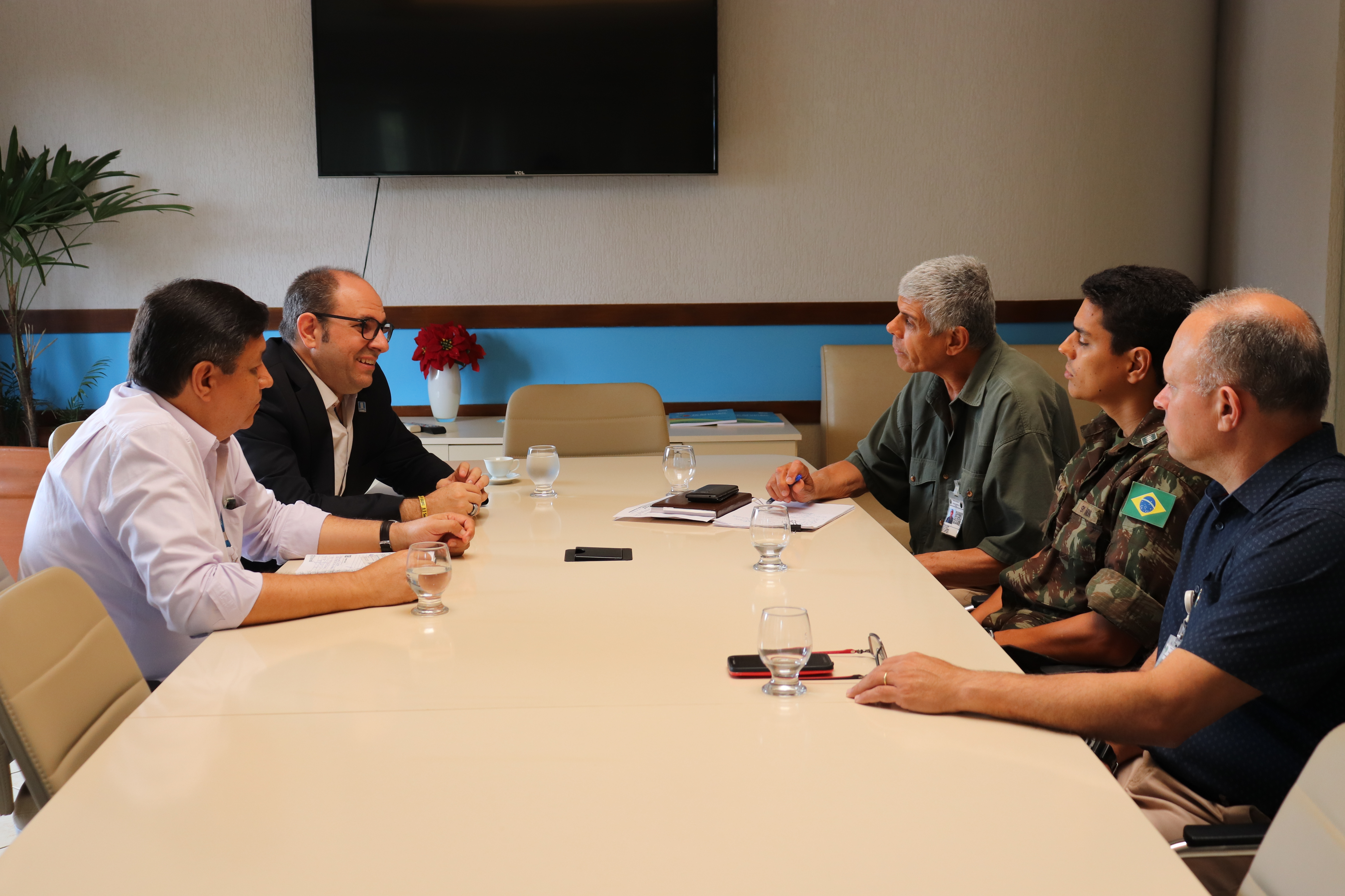 A primeira reunião entre a UFMS e o Comando Militar do Oeste (CMO) para o desenvolvimento de parceria na área da energia fotovoltaica foi realizada ontem (19). O reitor Marcelo Turine e o pró-reitor de Administração e Infraestrutura Augusto Malheiros receberam o Coronel José Roberto de Melo Queiroz, o Coronel Marcelo de Oliveira Soares e o Capitão Adelmo Benevides de Santana Junior. Adelmo é egresso do Programa de Pós-Graduação Stricto Sensu em Eficiência Energética e Sustentabilidade, Curso de Mestrado Profissional da UFMS, por meio do qual desenvolveu estudo sobre a implantação e a avaliação de sistemas fotovoltaicos junto ao CMO.