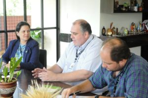 Na manhã de hoje (27) o chefe- geral da Empresa Brasileira de Pesquisa Agropecuária (Embrapa Pantanal) Jorge Antonio Ferreira de Lara, o analista de comunicação Thiago Nery da Cunha Coppola e a pesquisadora Aiesca Oliveira Pellegrin estiveram na UFMS para uma reunião com o Reitor Marcelo Turine e a Vice-Reitora Camila Ítavo. Aiesca atua também como professora no Doutorado em Ciência Animal da Universidade.