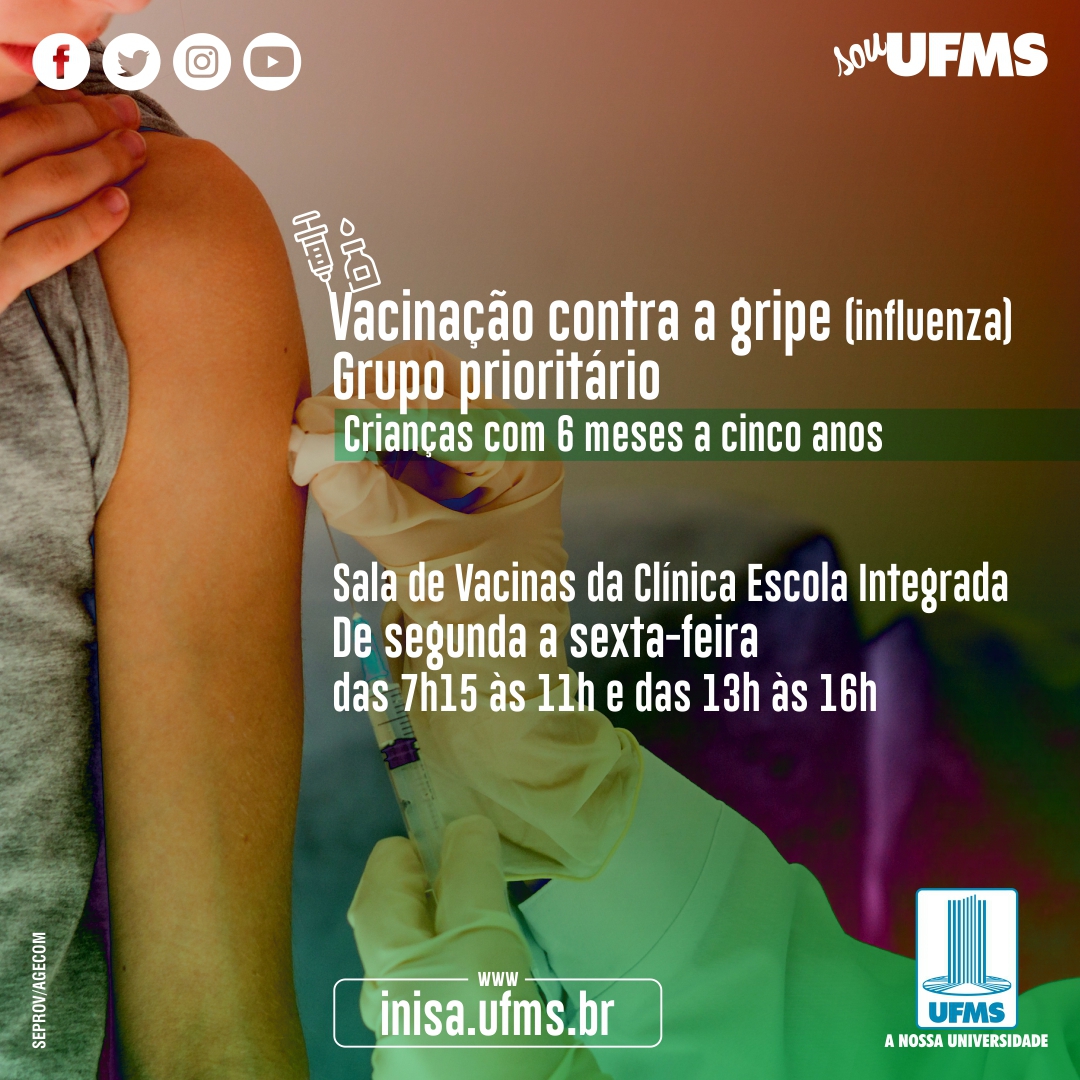 O atendimento na CEI é destinado a comunidade interna e externa da Universidade. Os dias e horários de funcionamento da Sala de Vacinas são: de segunda-feira a sexta-feira, das 7h15 às 11h e das 13h às 16h. Haverá distribuição de senhas no local. “Além da vacina contra a gripe, serão aplicadas também as doses contra a hepatite A e vacina meningocócica conjugada quadrivalente, que estão previstas no calendário de abril”, reforça o coordenador da CEI. Mais informações podem ser obtidas pelo telefone (67) 3345-7497.