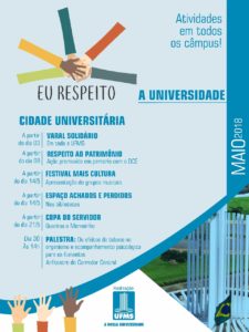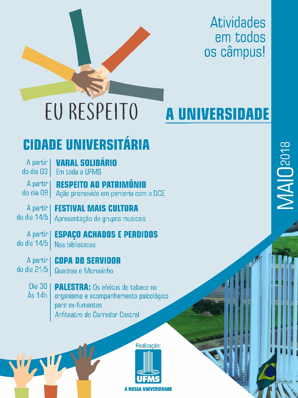 O foco da campanha Eu Respeito de maio é a Universidade, com o objetivo de valorizar o ambiente interno, bem como o patrimônio, servidores e o bem público. A campanha é uma iniciativa da UFMS para incentivar e enaltecer o respeito como valor na comunidade acadêmica.