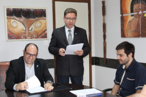 Tomaram posse, nesta terça-feira (3), quatro novos servidores: Aurélio Mateus Araújo Souza, como técnico administrativo (Classe D); Beatriz Maria Jorge, Rodrigo Mendes de Souza e Max Packer como professores adjuntos. “Desejo que vocês sejam felizes aqui e nos ajudem a cumprir nossa missão que é formar jovens talentos em todas as áreas do conhecimento. Fico muito satisfeito em saber que vocês escolheram continuar a carreira profissional na UFMS. Sei que alguns são de outro Estado, eu também era quando vim para cá. Apesar das dificuldades iniciais, construí minha vida profissional e minha família em Mato Grosso do Sul e, hoje, não troco esse Estado por nenhum outro”, comentou o reitor Marcelo Turine.