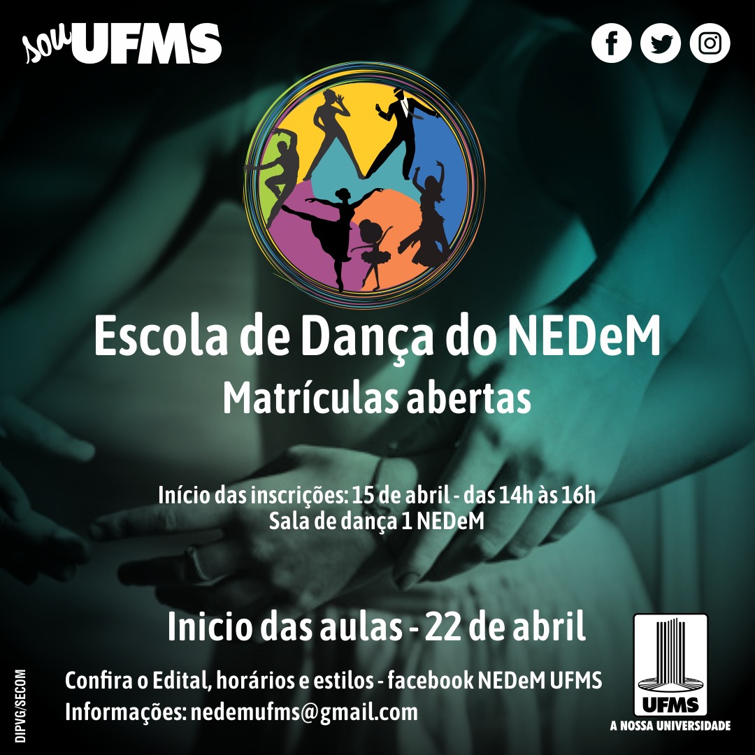 A Escola de Dança do Núcleo de Estudos em Dança e Movimento (Nedem) vai oferecer aulas de jazz, danças urbanas, sapateado americano e dança contemporânea. As matrículas podem ser feitas entre os dias 15 e 26 de abril. A Escola de Dança do Nedem é um projeto de extensão da UFMS.