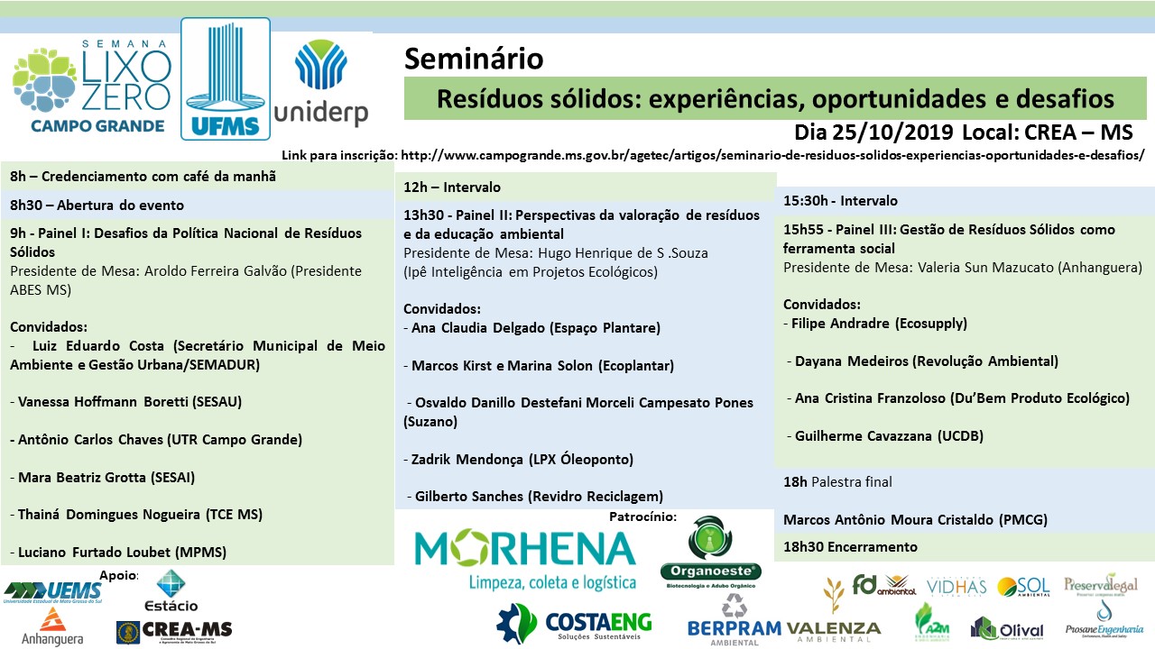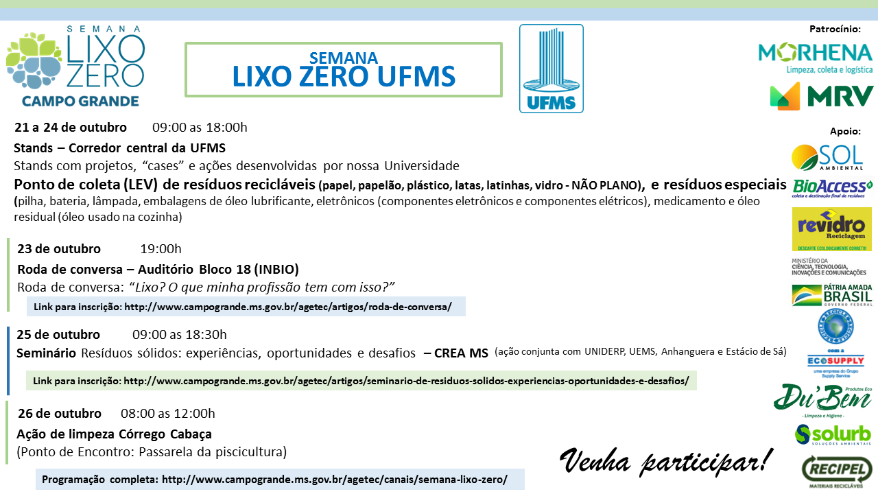 Além disso, nos dias 25 e 26 serão realizadas duas atividades conjuntas com a Uniderp. No dia 25, as instituições realizam o Seminário Resíduos Sólidos: experiências, oportunidades e desafios, no auditório do Conselho Regional de Engenharia e Agronomia (Crea-MS). “E no dia 26, as duas universidades em parceria com a empresa Revolução Ambiental farão uma coleta de resíduos no Córrego Cabaça”, comenta a professora.