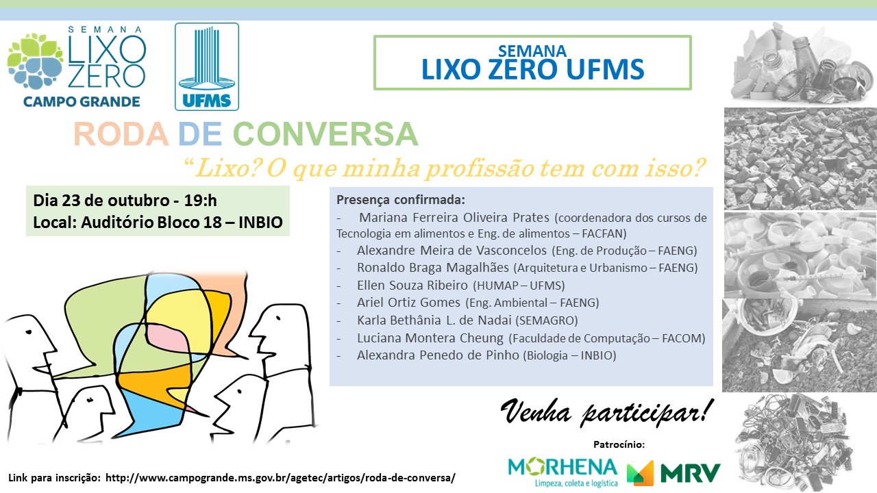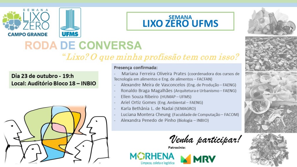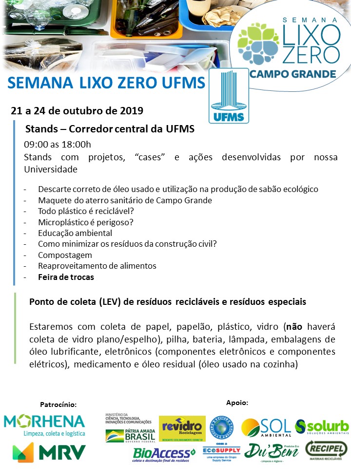 Entre os dias 21 e 26 de outubro será realizada a Semana Lixo Zero, o evento é promovido pela UFMS e a Uniderp. “ Trata-se de uma semana realizada em nível nacional, pensada para fomentar e disseminar a educação e, principalmente, a sensibilização ambiental. Muitas vezes temos a consciência ambiental, mas falta a sensibilização e também a atitude”, disse a professora da Faculdade de Engenharias, Arquitetura e Urbanismo e Geografia (Faeng) Karina Righi Cavallaro.