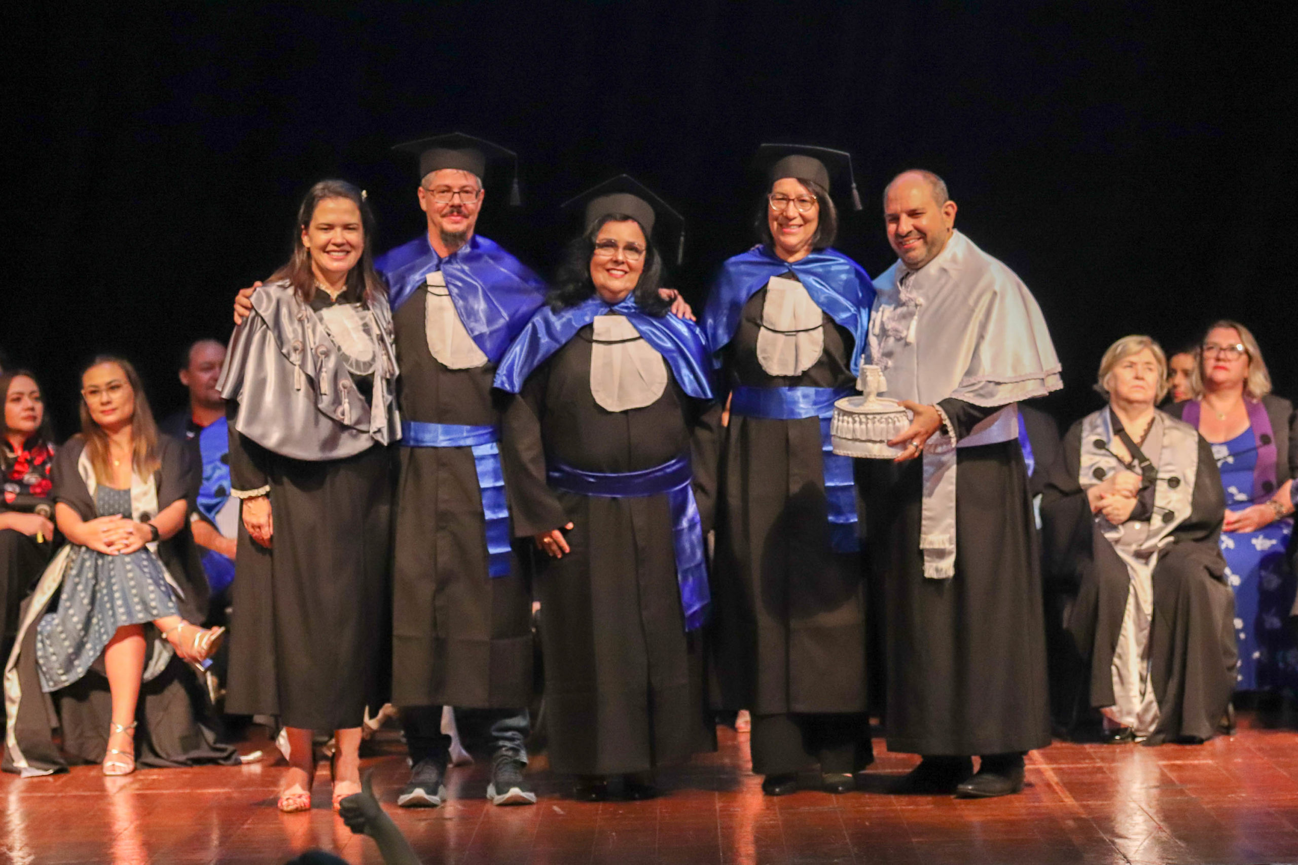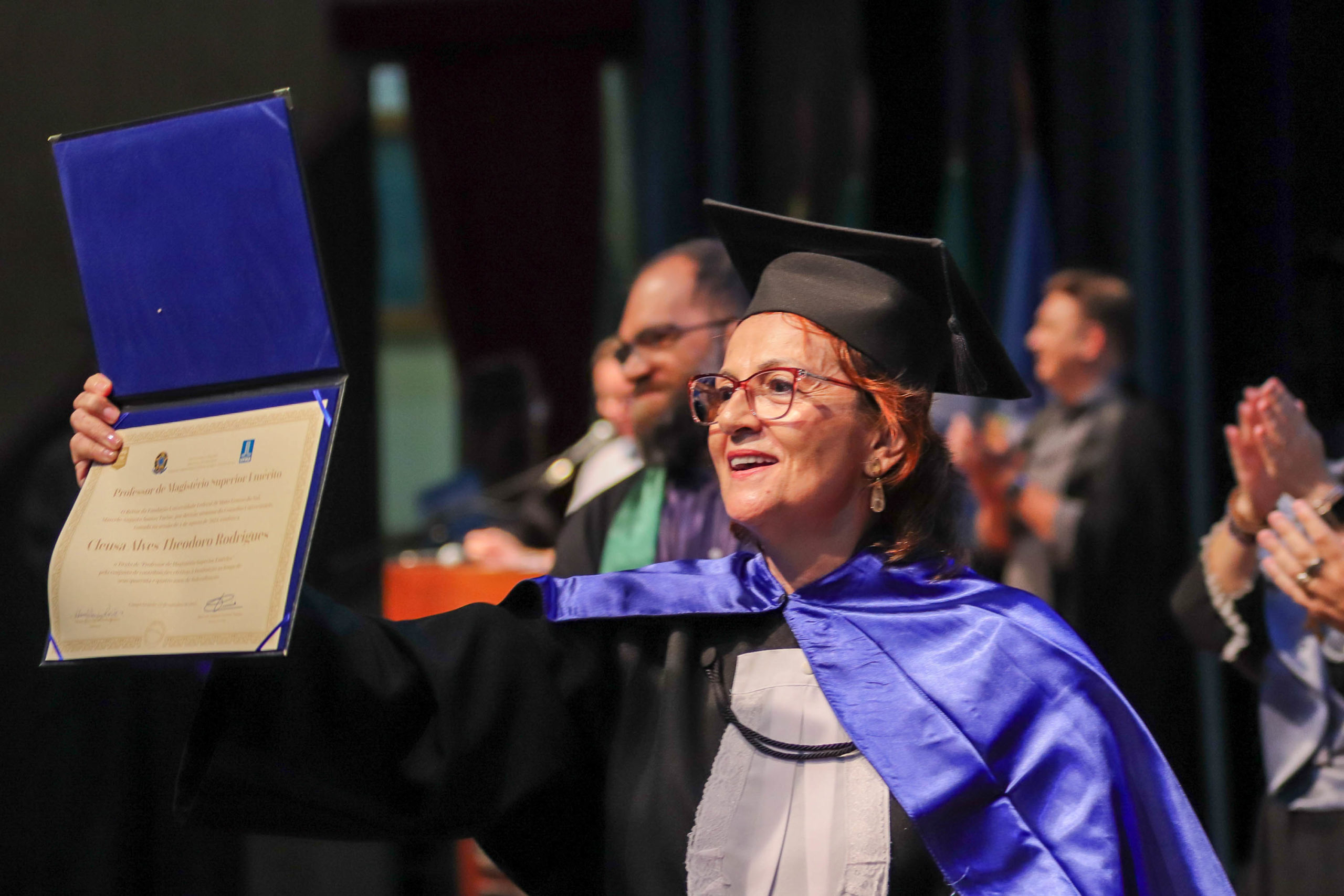 Foram entregues 67 títulos honoríficos e medalhas de Professor de Magistério Superior Emérito e de Técnico-Administrativo em Educação Emérito e 15 medalhas da Ordem de Mérito de Egresso. “Essa é uma manhã muito especial. Estou feliz em estar com vocês e agradeço aos nossos gestores pelo fomento ao reconhecimento dos nossos servidores que tanto lutam por uma Universidade nota 10. Steve Jobs, em discurso proferido em uma das melhores universidades do mundo, disse: ‘seu trabalho preencherá grande parte da sua vida e o único jeito de estar verdadeiramente satisfeito é fazer o que você acredita ser um excelente trabalho e, um excelente trabalho, só nasce do amor pelo que se faz’. Aqui, temos vários exemplos de pessoas que amam o que fazem e se dedicam e honram à nossa Instituição. Não há nada mais engrandecedor do que se dedicar ao crescimento do próximo”, disse a presidente da Comissão de Análise dos Títulos Honoríficos de Professor de Magistério Superior Emérito e de Técnico-Administrativo em Educação Emérito e pró-reitora de Gestão de Pessoas, Gislene Walter da Silva.