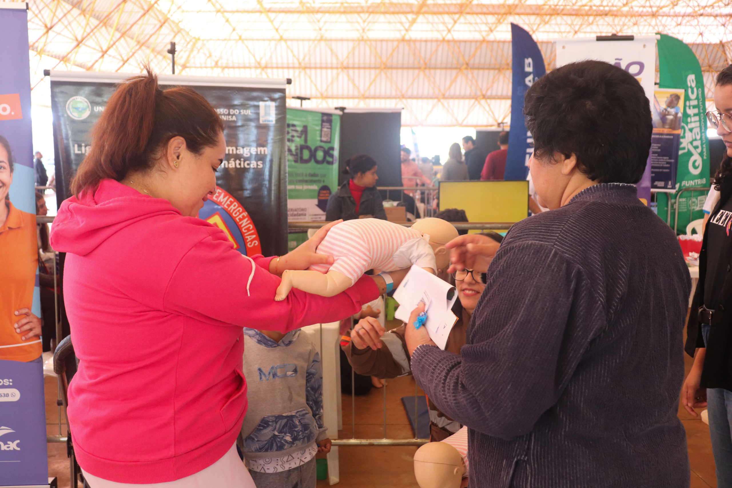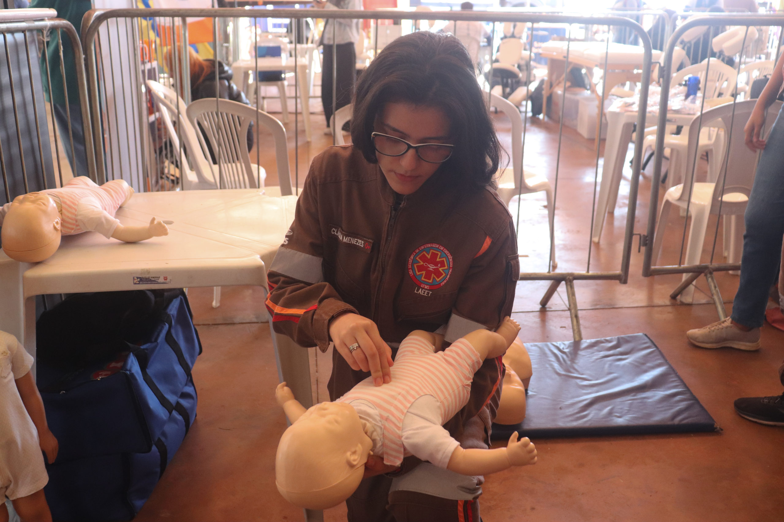 Já em outro estande, a estudante do curso de Enfermagem do Instituto Integrado de Saúde Cláudia Menezes representou a Liga Acadêmica de Enfermagem em Emergências Traumáticas com informações sobre primeiros socorros. “Estamos ensinando o manejo para situações como convulsão, situações de acidente vascular cerebral e de infarto, que são os mais recorrentes na população, e também o manejo para desengasgos e parada cardiorrespiratória de lactantes, crianças na idade escolar e nos adultos. Essa formação para o pessoal que é da comunidade pode capacitar cada vez mais gente, para que a gente possa ter essa segurança de atender o nosso familiar e estar sempre preparado para as adversidades que a vida coloca no nosso caminho. Como estudante, vejo que essa é uma grandíssima oportunidade”.