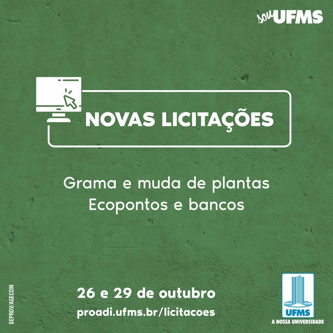 Nesta terça-feira, 26, e na sexta-feira, 29, serão realizados pregões eletrônicos para registro de preços visando à aquisição de plantas e grama, e ecopontos e bancos, respectivamente. “A UFMS tem aperfeiçoado a sua Política de Sustentabilidade, promovendo cada vez mais, aquisições e contratações com aderência aos padrões socioambientais sustentáveis, adotando práticas de racionalização e eficiência no uso de recursos, por meio de ações de conservação e reuso de águas e eficiência energética, promovendo a educação ambiental em suas atividades, a priorização e conservação de áreas verdes, incentivo e aderência à geração de energia limpa, redução da pegada de carbono, além da busca de condições de melhora da qualidade de vida no ambiente de trabalho e estudo, de modo a aumentar a produtividade e o bem estar na Instituição”, explica o pró-reitor de Administração e Infraestrutura (Proadi) Augusto Malheiros.