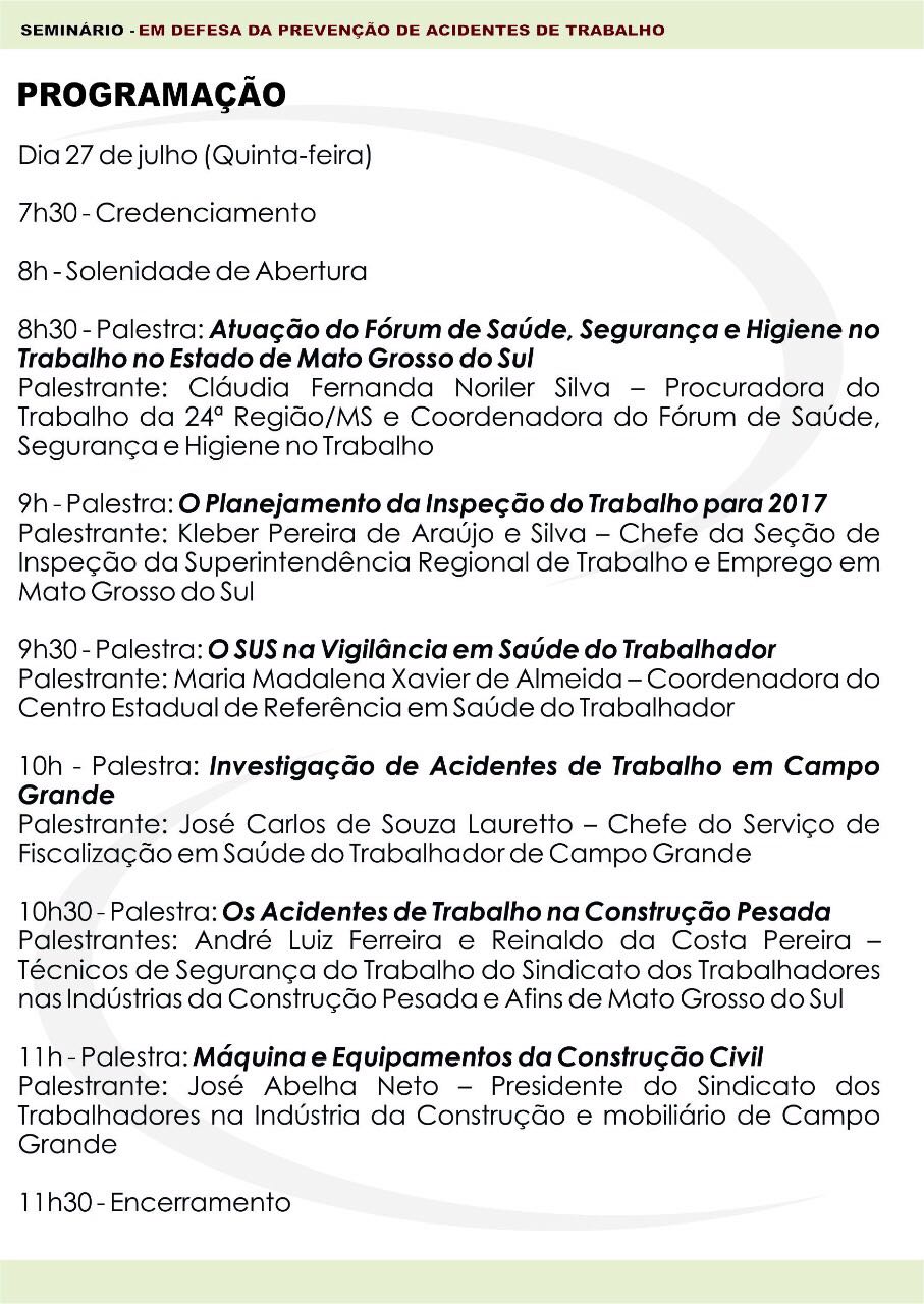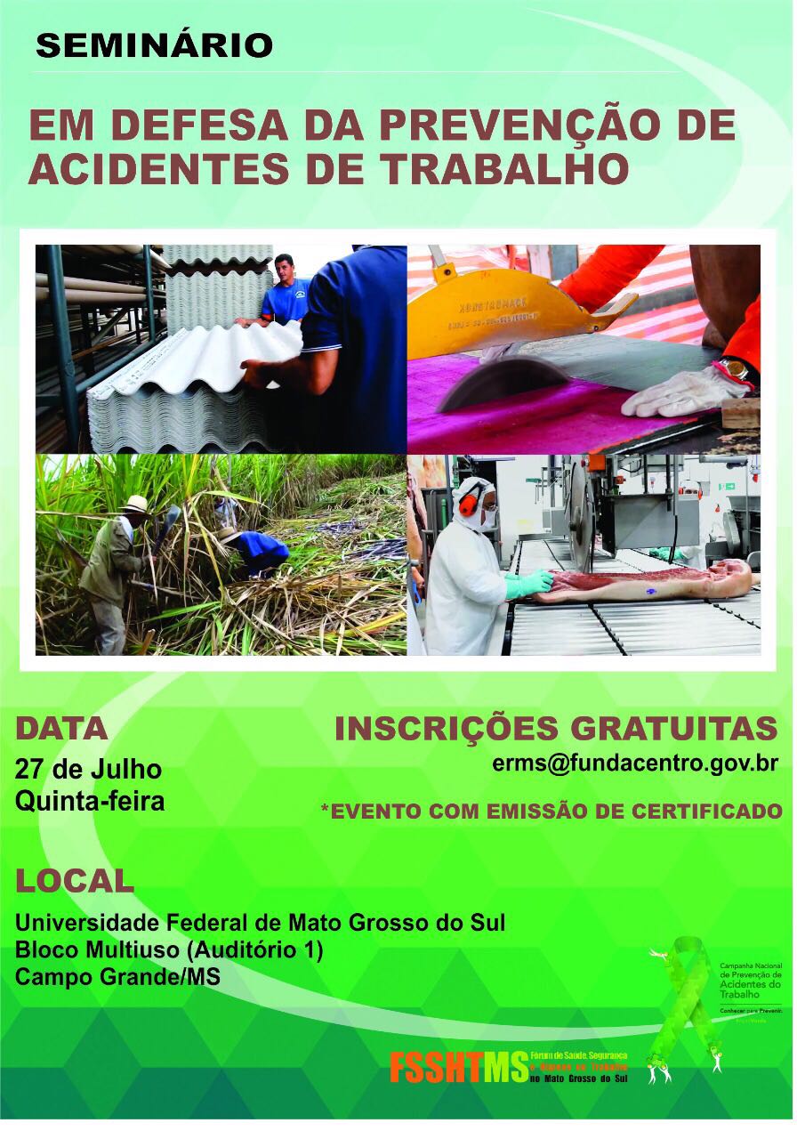 No próximo dia 27 de julho (quinta-feira) será realizado no Auditório 1 do Complexo Multiuso o Seminário em Defesa da Prevenção de Acidentes de Trabalho. O objetivo é conscientizar empresas, trabalhadores e sociedade da importância da prevenção dos acidentes e doenças do trabalho.