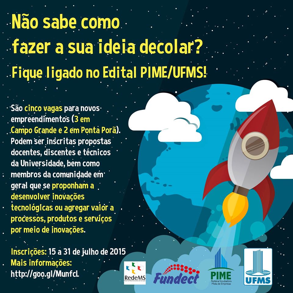 A taxa de inscrição é de R$50 e deve ser paga por meio do Guia de Recolhimento da União. As propostas devem ser encaminhadas para o e-mail sec.pime@ufms.br juntamente com outros documentos identificados no edital do processo seletivo, disponível aqui. Mais informações sobre inscrições e o cronograma completo das atividades do processo podem ser obtidos no edital ou no site da PIME.