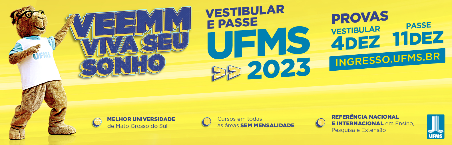 A prova do Vestibular UFMS 2023 será realizada no próximo domingo, dia 4 de dezembro, das 8h às 13h (horário de Mato Grosso do Sul), tanto na Cidade Universitária e na UCDB, em Campo Grande, quanto nos municípios de Aquidauana, Chapadão do Sul, Campo Grande, Corumbá, Coxim, Dourados, Naviraí, Nova Andradina, Paranaíba, Ponta Porã e Três Lagoas. A avaliação é composta por 60 questões objetivas de múltipla escolha e uma redação. Veja o Manual de Candidato, com as orientações para a prova e comentários sobre a redação.