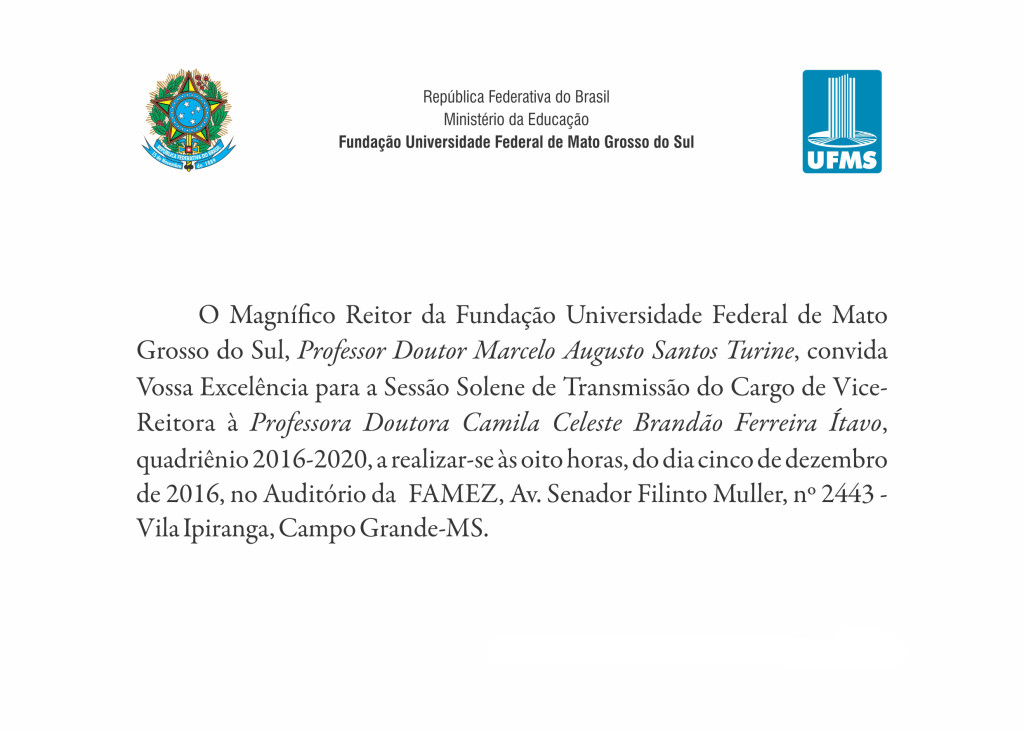 O Reitor da UFMS, professor Marcelo Augusto Santos Turine convida as comunidades interna e externa para participar da Sessão Solene de Transmissão do Cargo de Vice-Reitor à professora Camila Celeste Brandão Ferreira Ítavo, para o quadriênio 2016-2020. A cerimônia será realizada na próxima segunda-feira, 5, às 8 horas, no auditório da Famez.