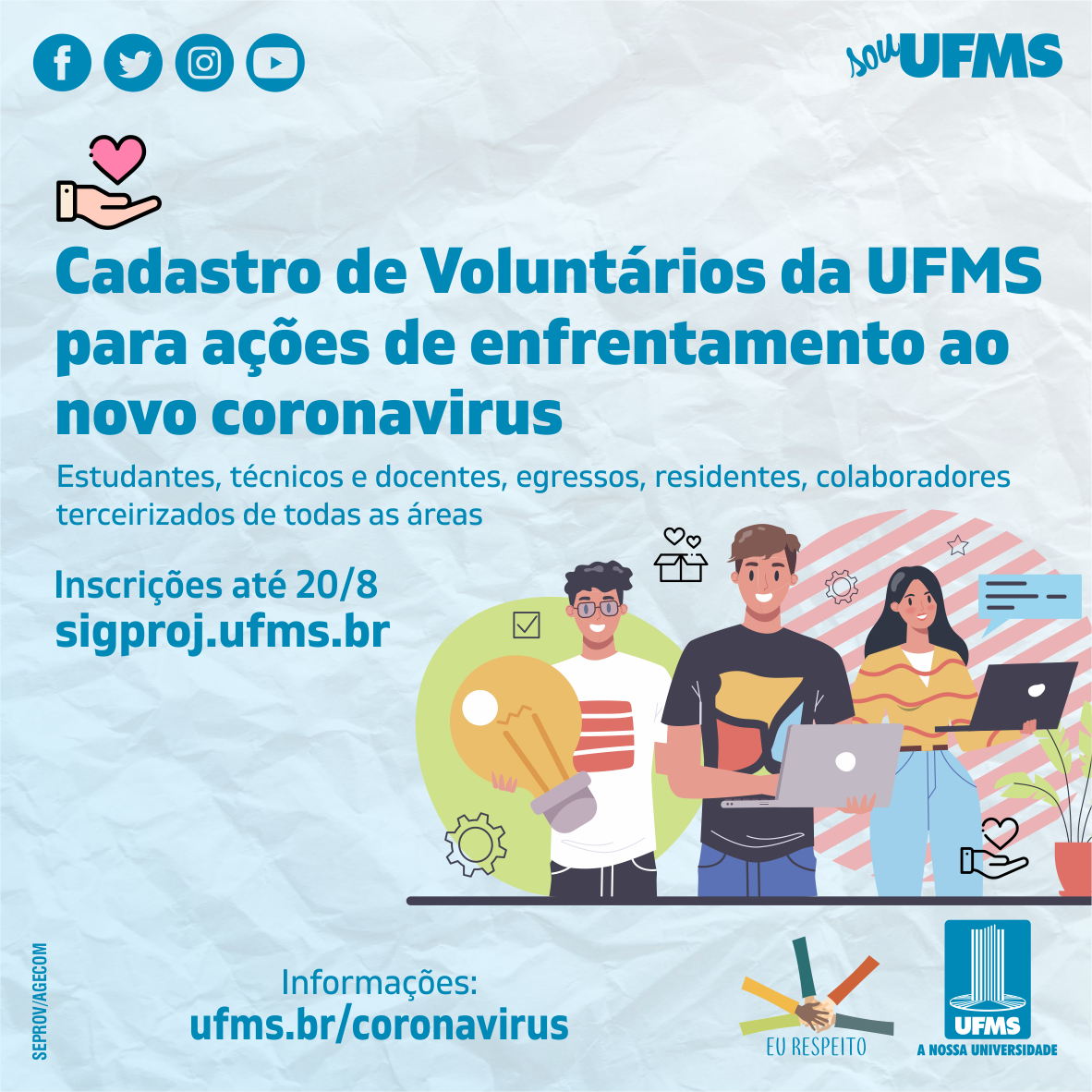 Interessados em atuar como voluntários em ações para o enfrentamento ao novo coronavirus promovidas por diferentes órgãos e agências públicas terão de 24 de maio a 20 de agosto para se cadastrarem junto à UFMS. A inscrição deve ser feita no Sigproj por meio do preenchimento de um formulário.