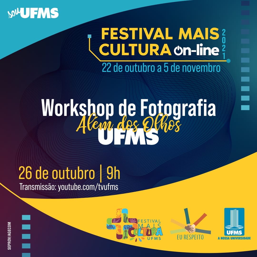 Interessados na arte de capturar e eternizar imagens poderão participar, no dia 26 de outubro, a partir das 9h, do workshop de fotografia UFMS Além dos Olhos. O evento, que integra tanto o projeto de cultura de mesmo nome quanto a programação do Festival Mais Cultura 2021, será virtual, com transmissão pelo canal da TV UFMS.