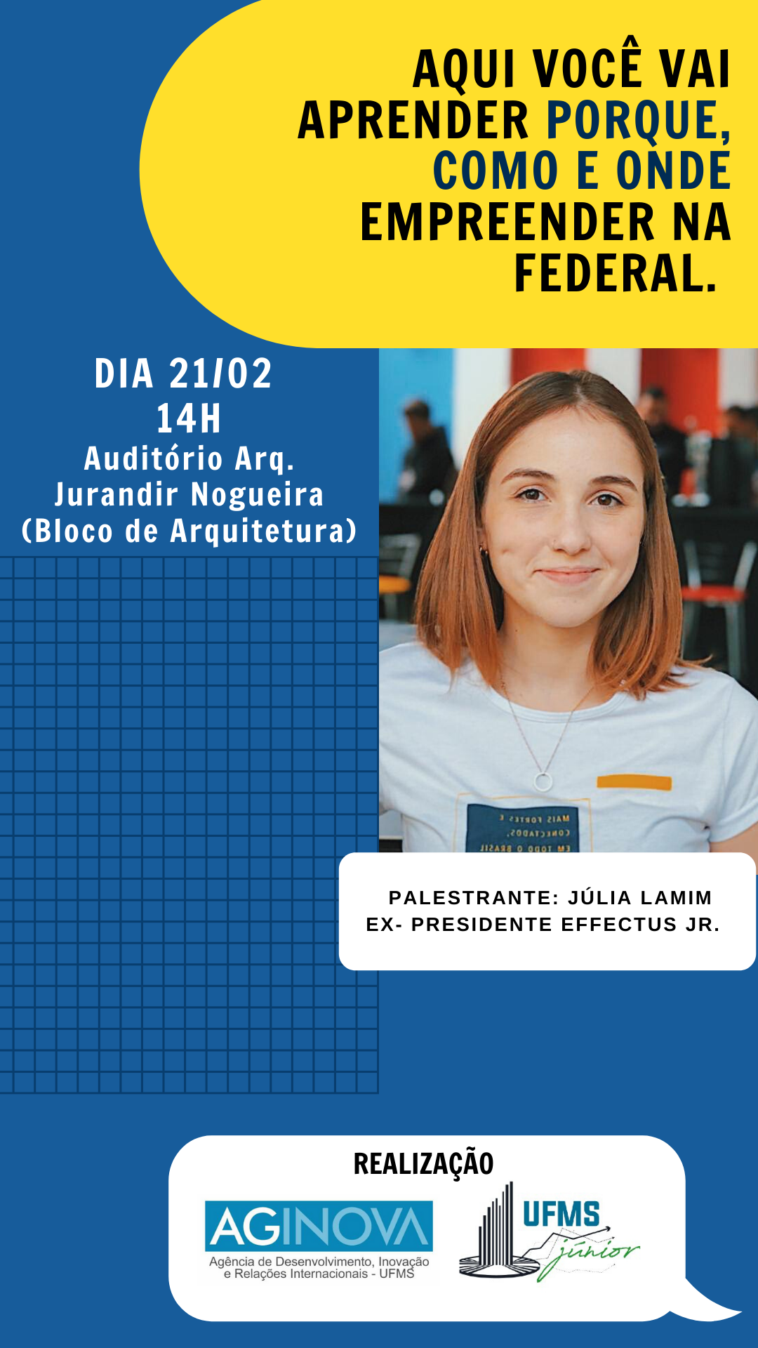 O workshop será apresentado por Júlia Lamin, ex-presidente da Empresa Júnior da Escola de Administração e Negócios, Effectus Júnior.