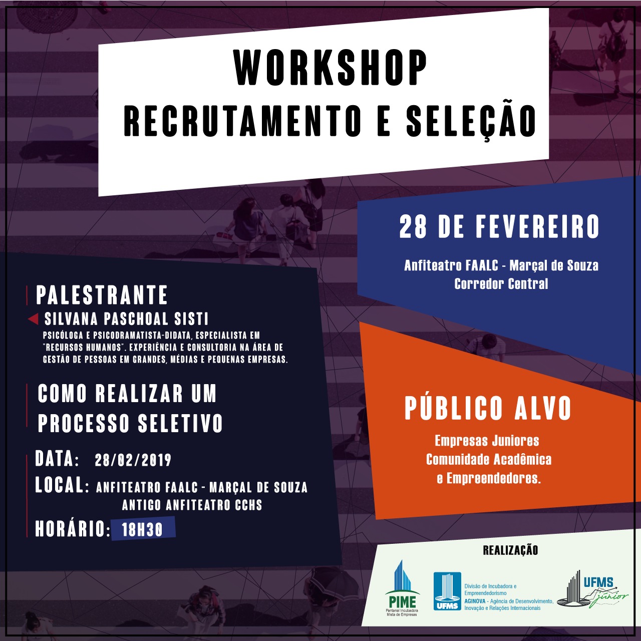 O programa UFMS Junior, em parceria com a Pantanal Incubadora Mista de Empresas (PIME-UFMS), realizará workshop sobre recrutamento e processo seletivo nesta quinta-feira (28), a partir das 18h30, no anfiteatro da FAALC.